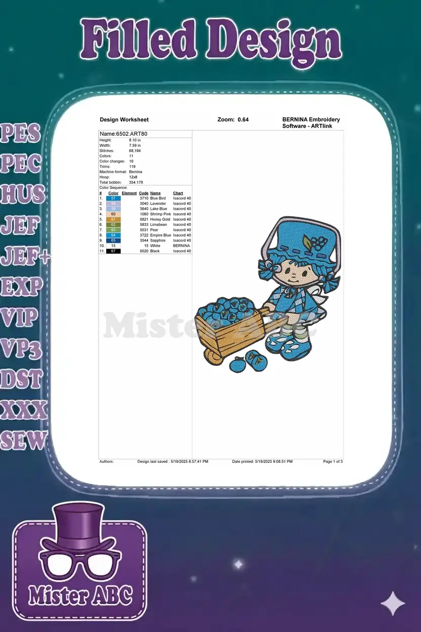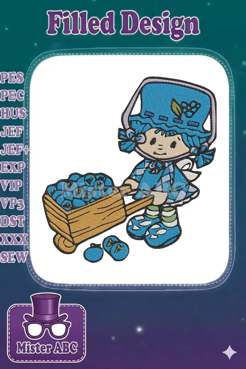 Cute cartoon blueberry girl with cart full of fruit embroidery designs – Instant Download