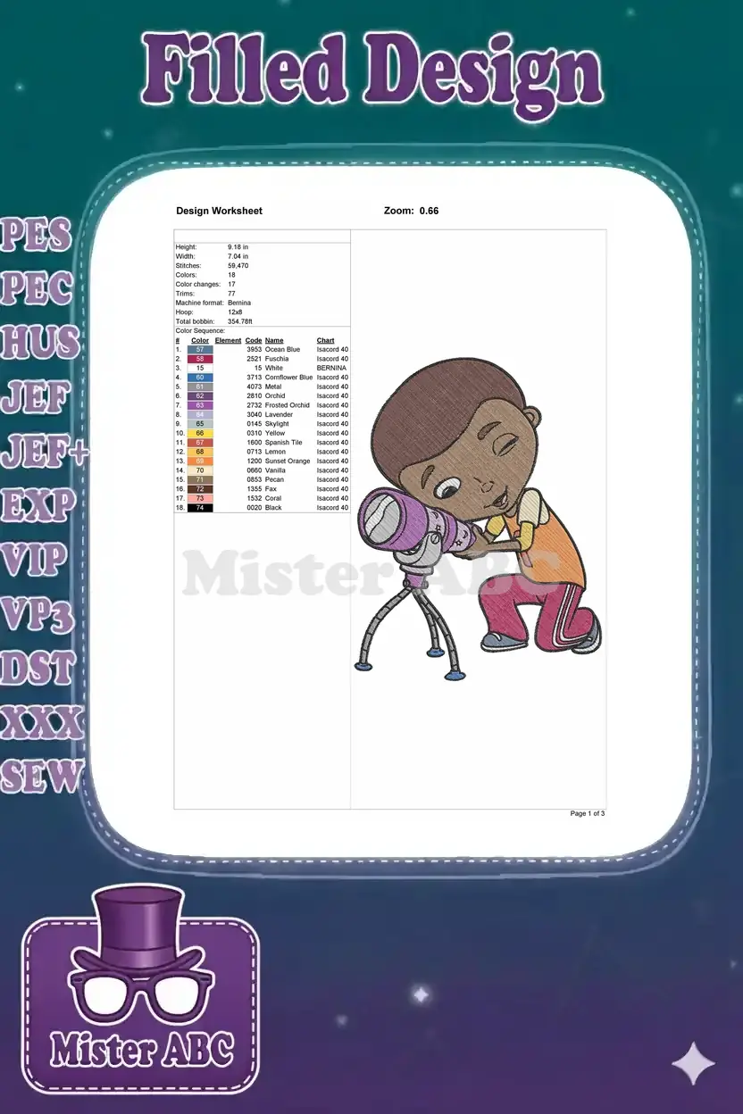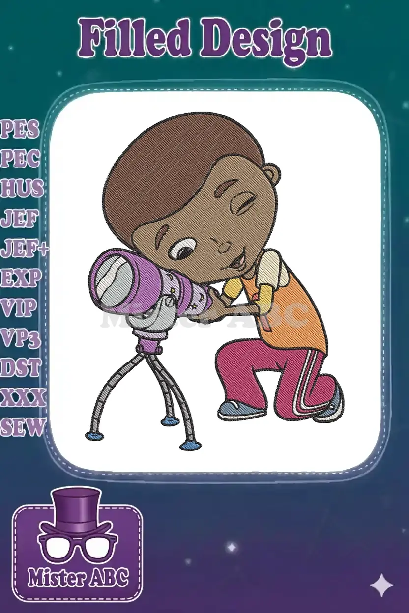 Cute cartoon boy exploring space with a purple telescope embroidery designs