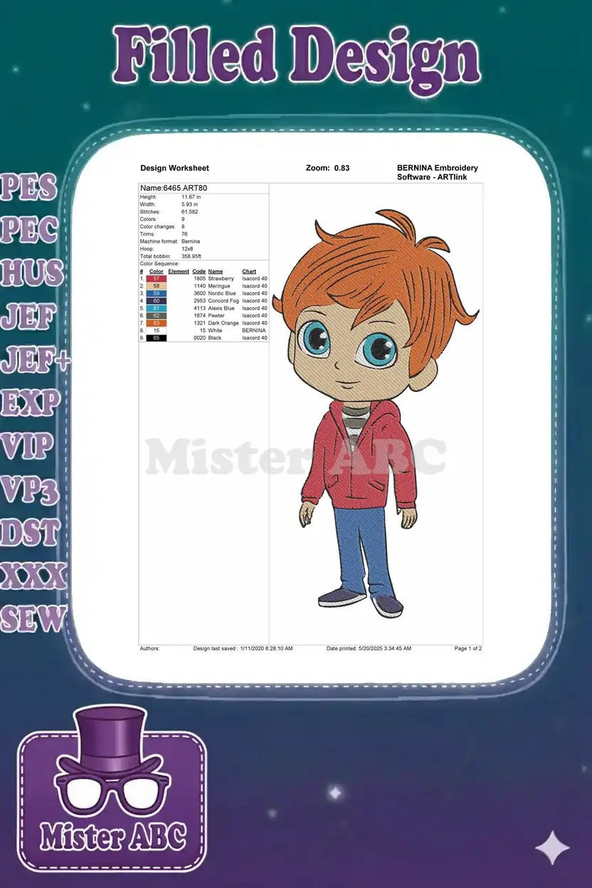 Cute cartoon boy with orange hair and red hoodie embroidery designs