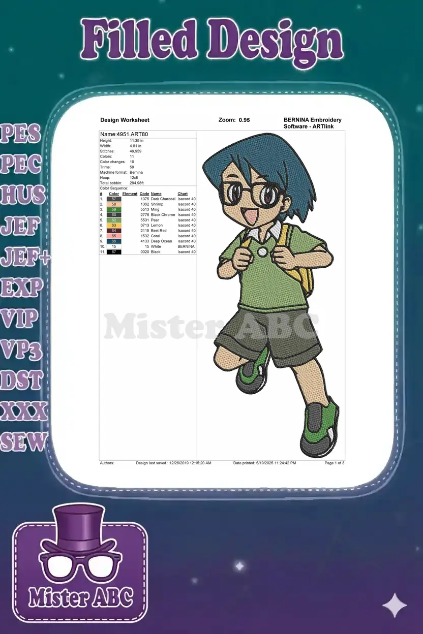 Cute cartoon boy running with backpack and glasses embroidery designs
