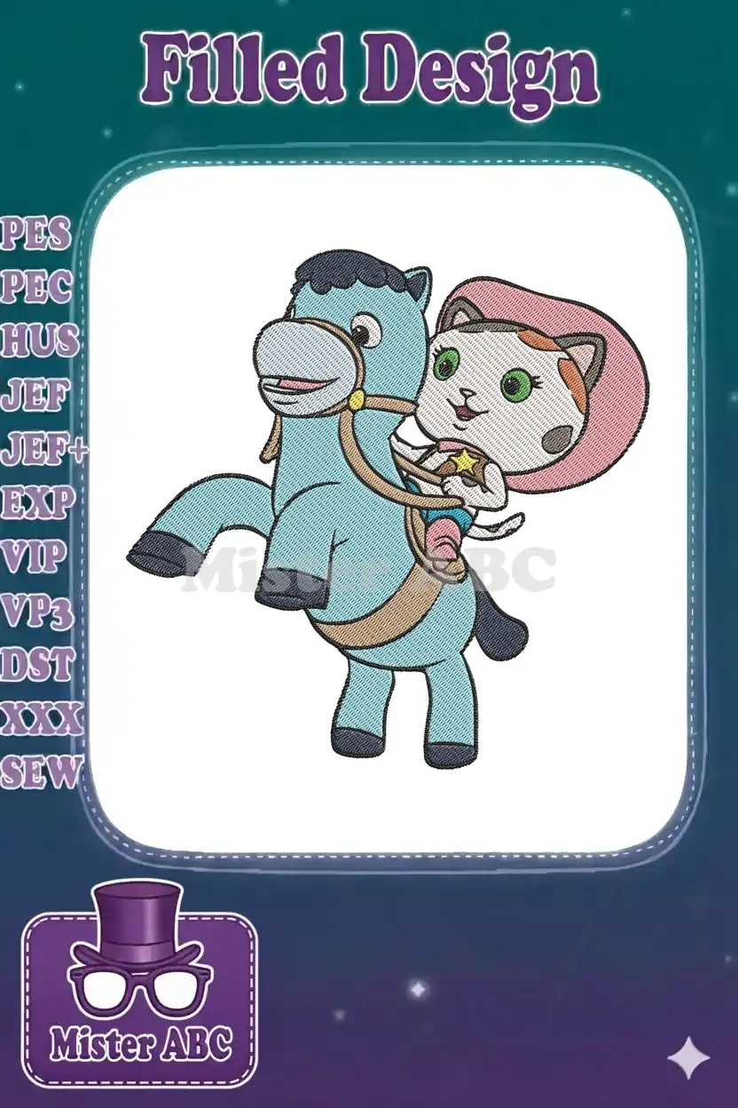 Cute cartoon cowboy cat riding blue horse embroidery designs