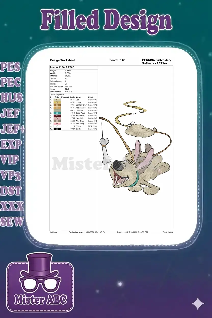 Cute cartoon dog Dug chasing bone scent trail embroidery designs