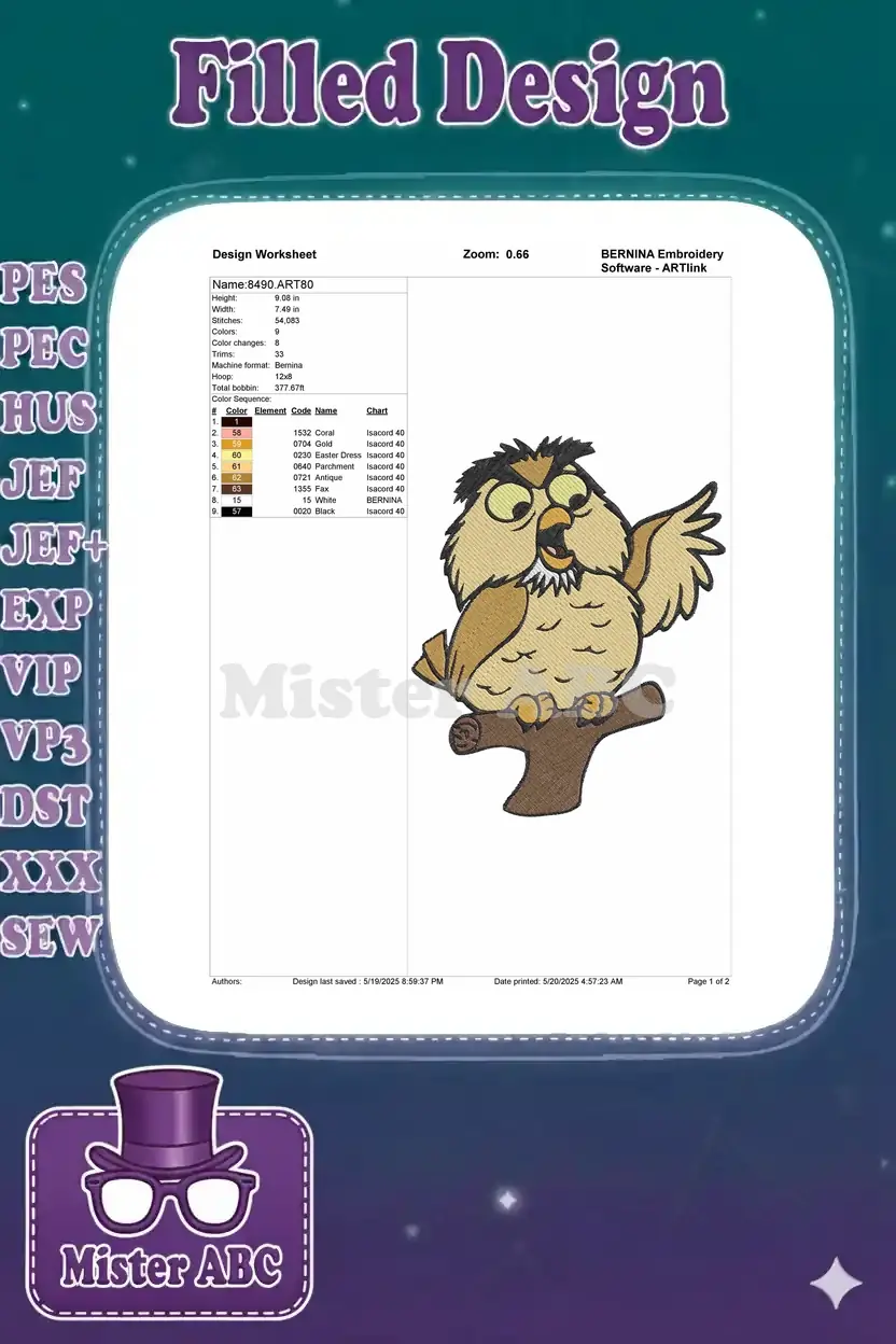 Cute Cartoon Owl Hooting on Branch Embroidery Designs