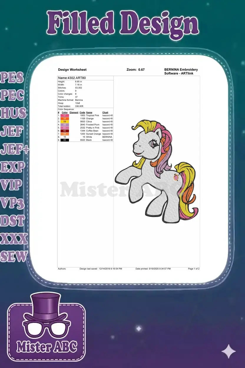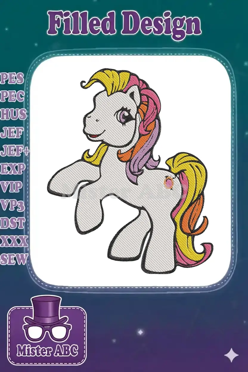 Bring a touch of nostalgic charm to your projects with this vibrant, playful pony embroidery design, perfect for fans.