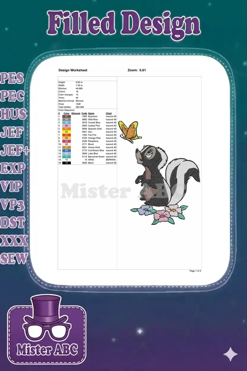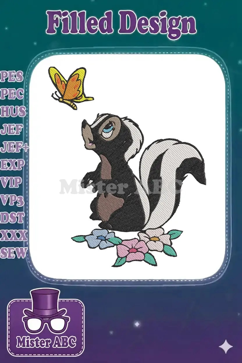 An adorable skunk gazes at a playful butterfly amidst colorful flowers, perfect for charming embroidery projects. This delightful design adds whimsy to any item!