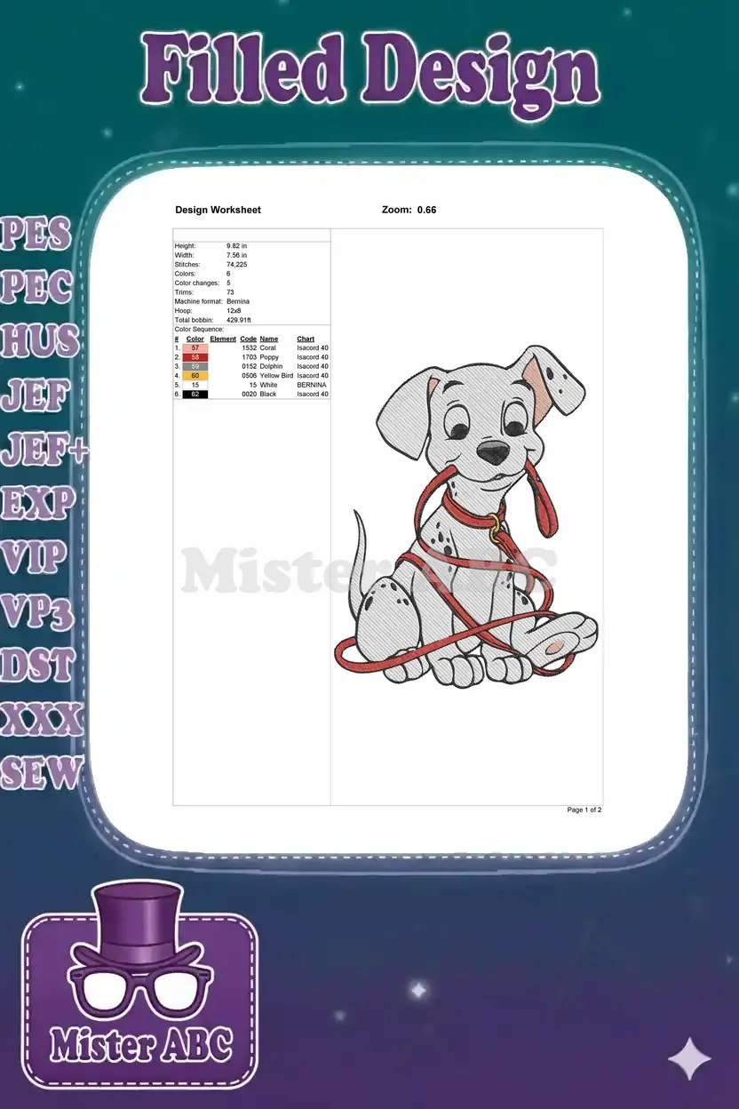 Cute Dalmatian Puppy with Red Leash Embroidery Designs