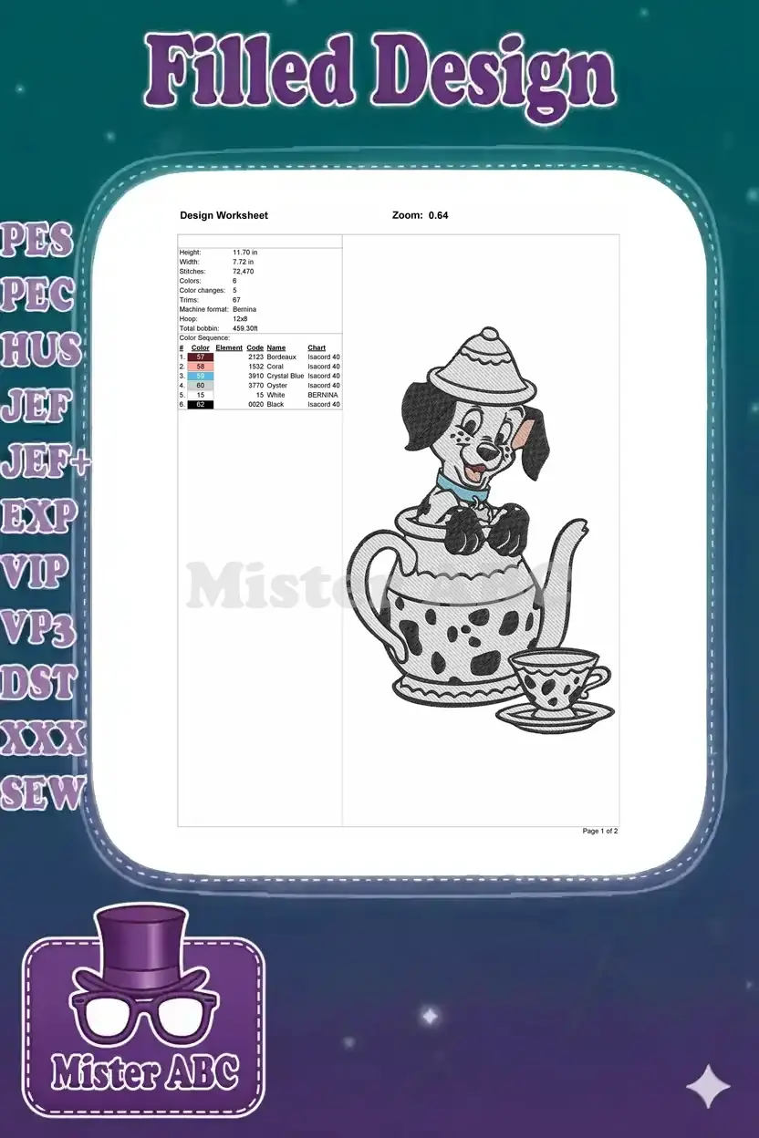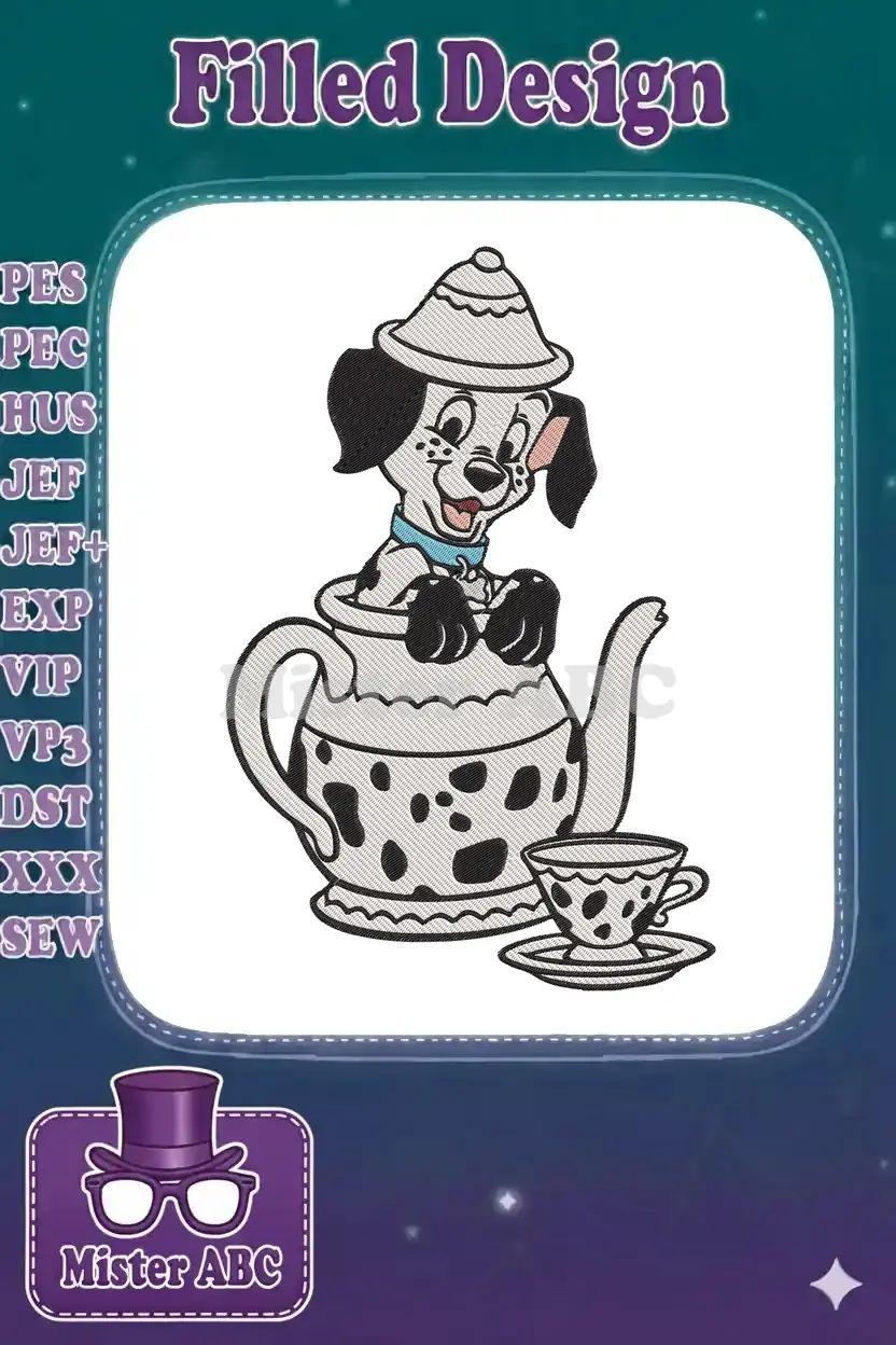 Charming embroidery design featuring an adorable Dalmatian puppy peeking from a polka-dotted teapot, perfect for adding whimsy.