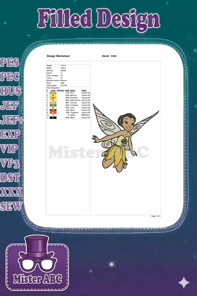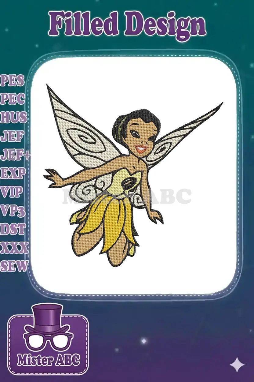 Cute dark-haired fairy with yellow dress and wings embroidery designs