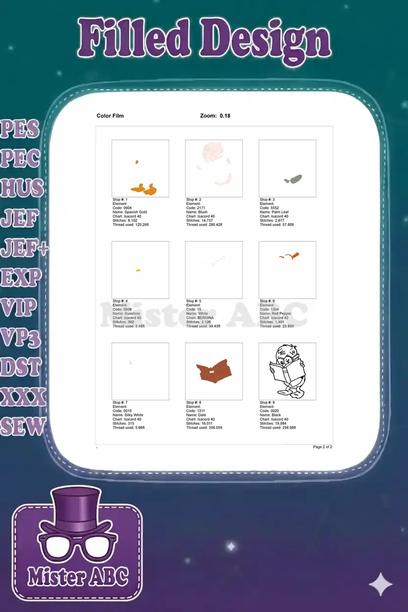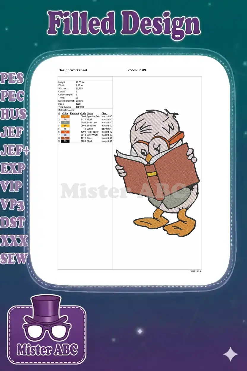Cute duckling wearing glasses reading book embroidery designs