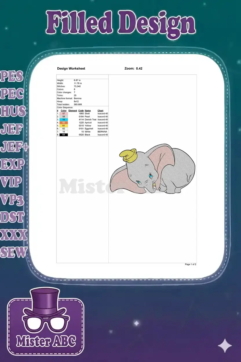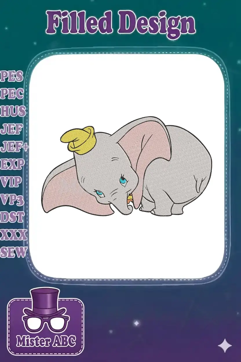 Cute Dumbo flying elephant with yellow hat embroidery designs