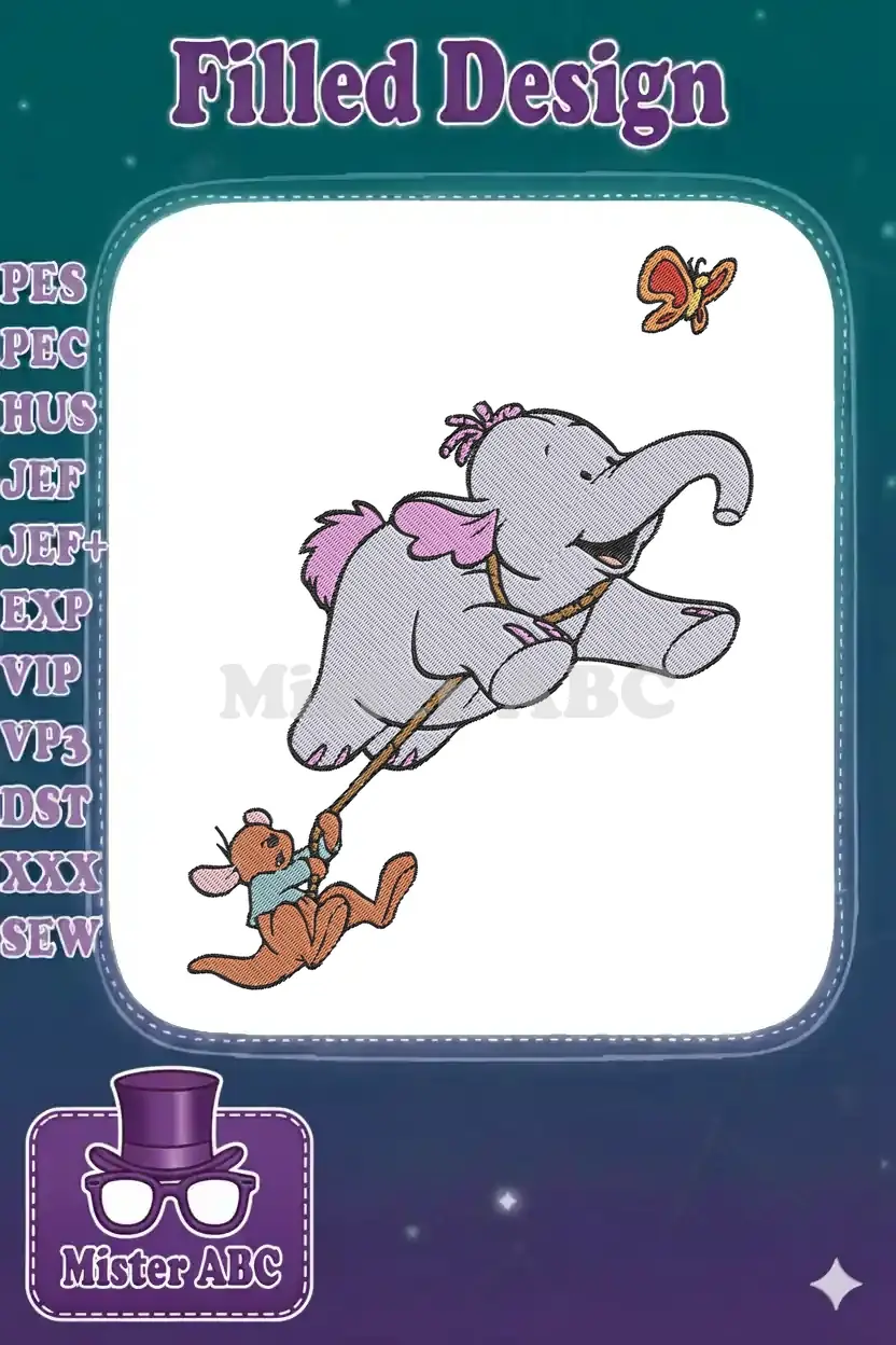 Cute elephant and kangaroo flying with butterfly embroidery designs