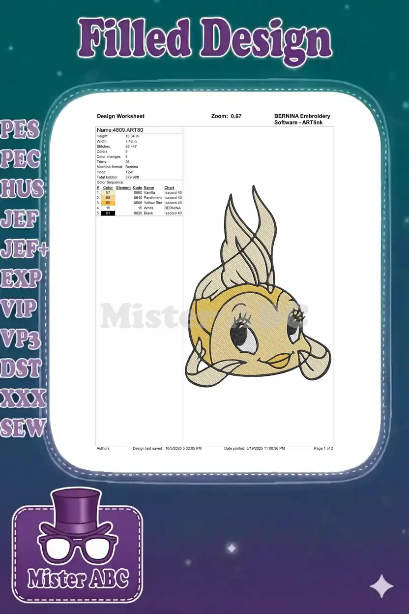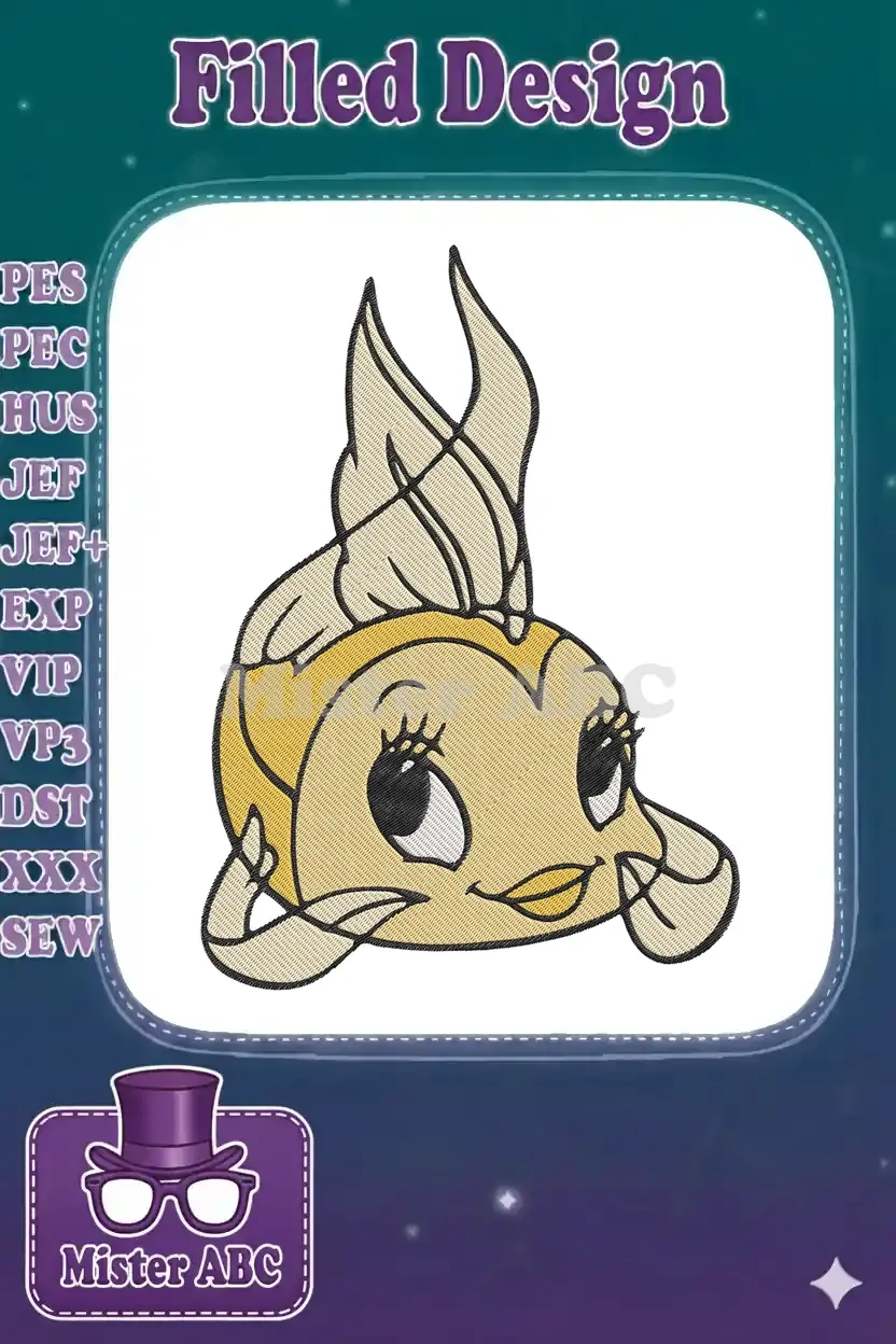 Cute golden cartoon fish character with flowing fins embroidery designs