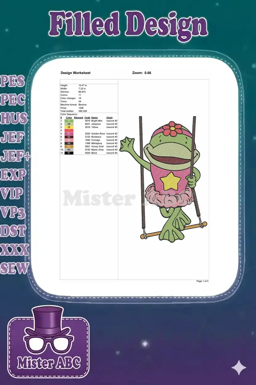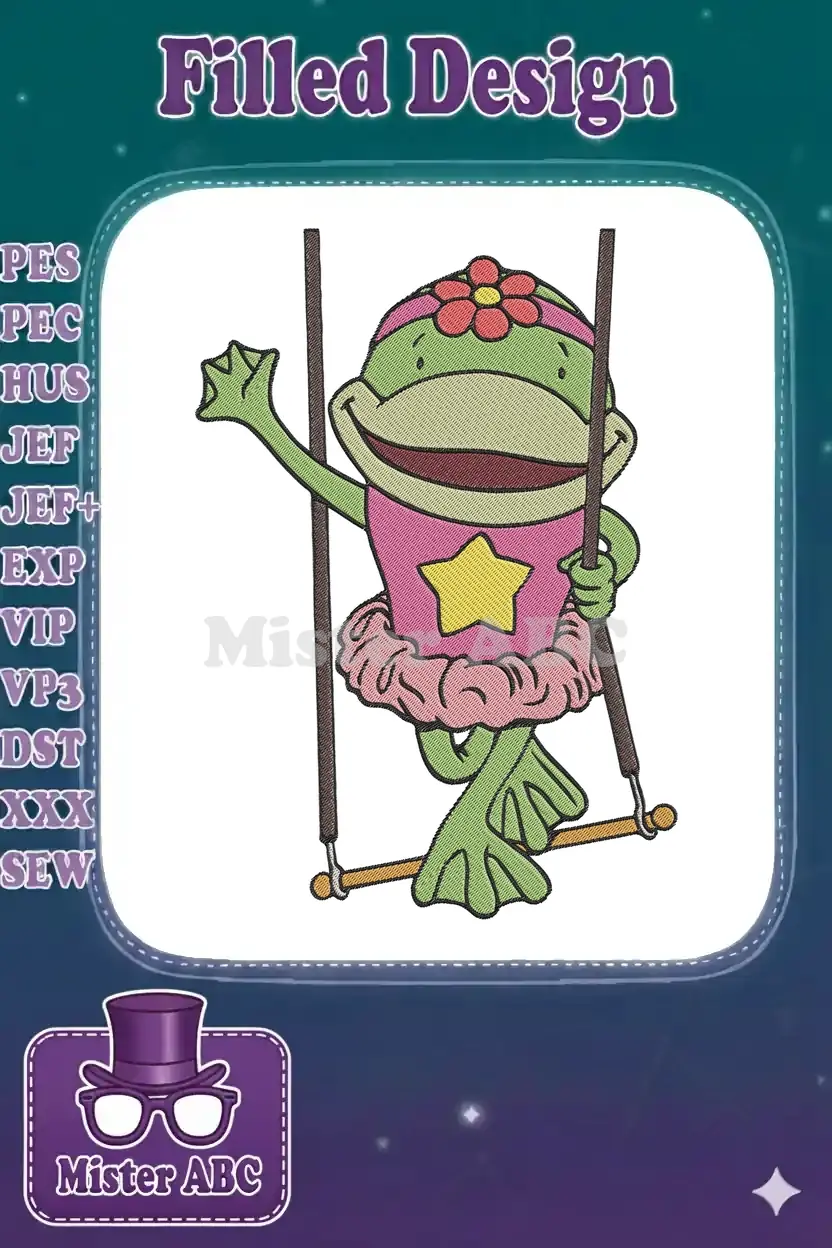 Cute Green Ballerina Frog on Swing Embroidery Designs