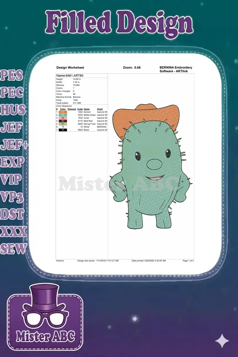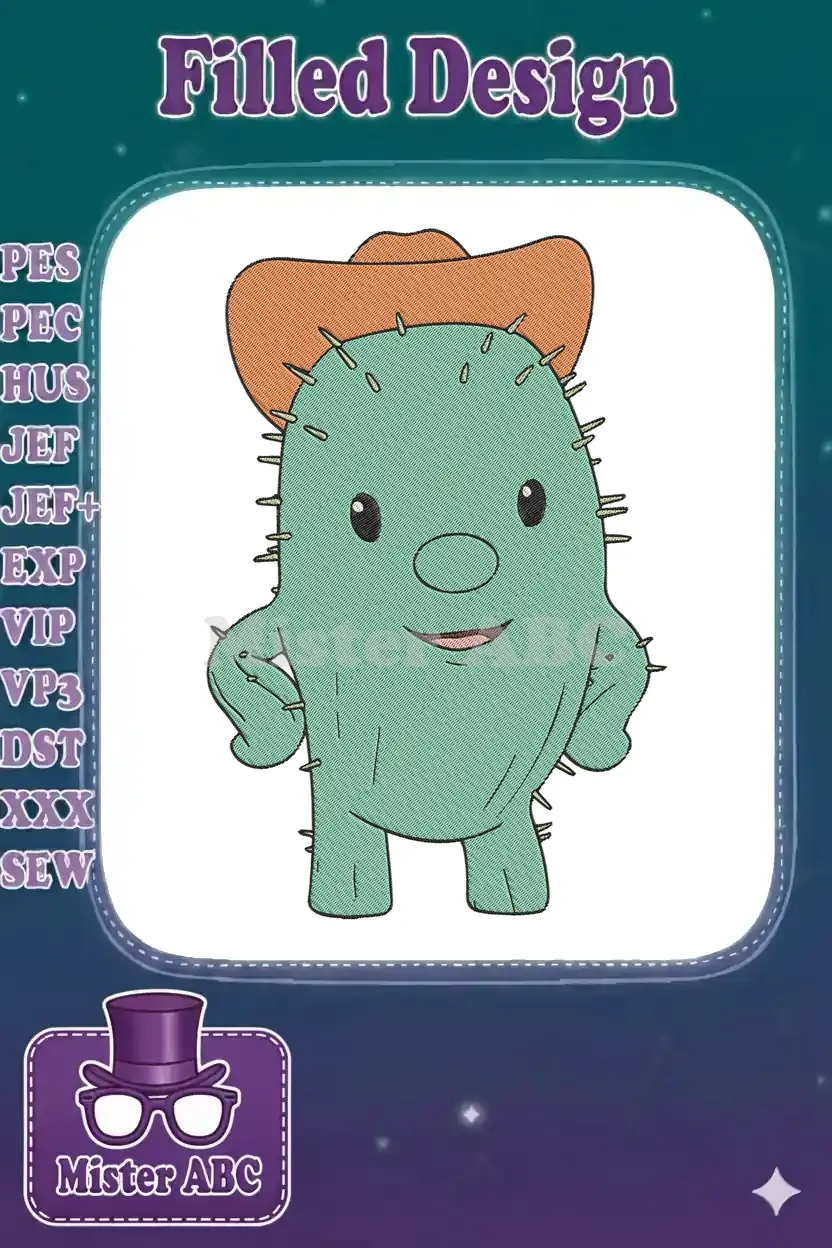 Cute Green Cactus Cowboy Hat Embroidery Designs for Western Theme