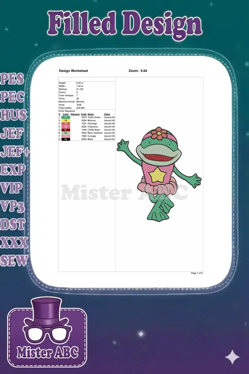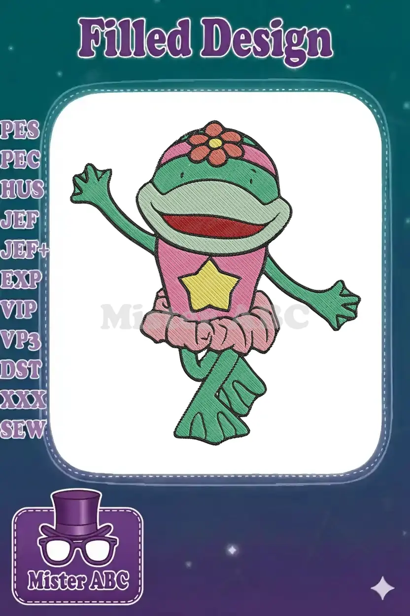 Cute green frog ballerina with pink tutu embroidery designs