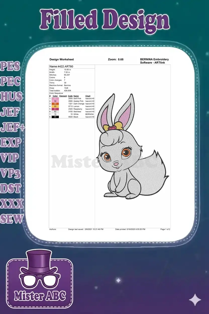 Adorable, big-eyed cartoon bunny embroidery with a charming bow. Ideal for adding a playful touch to any project.