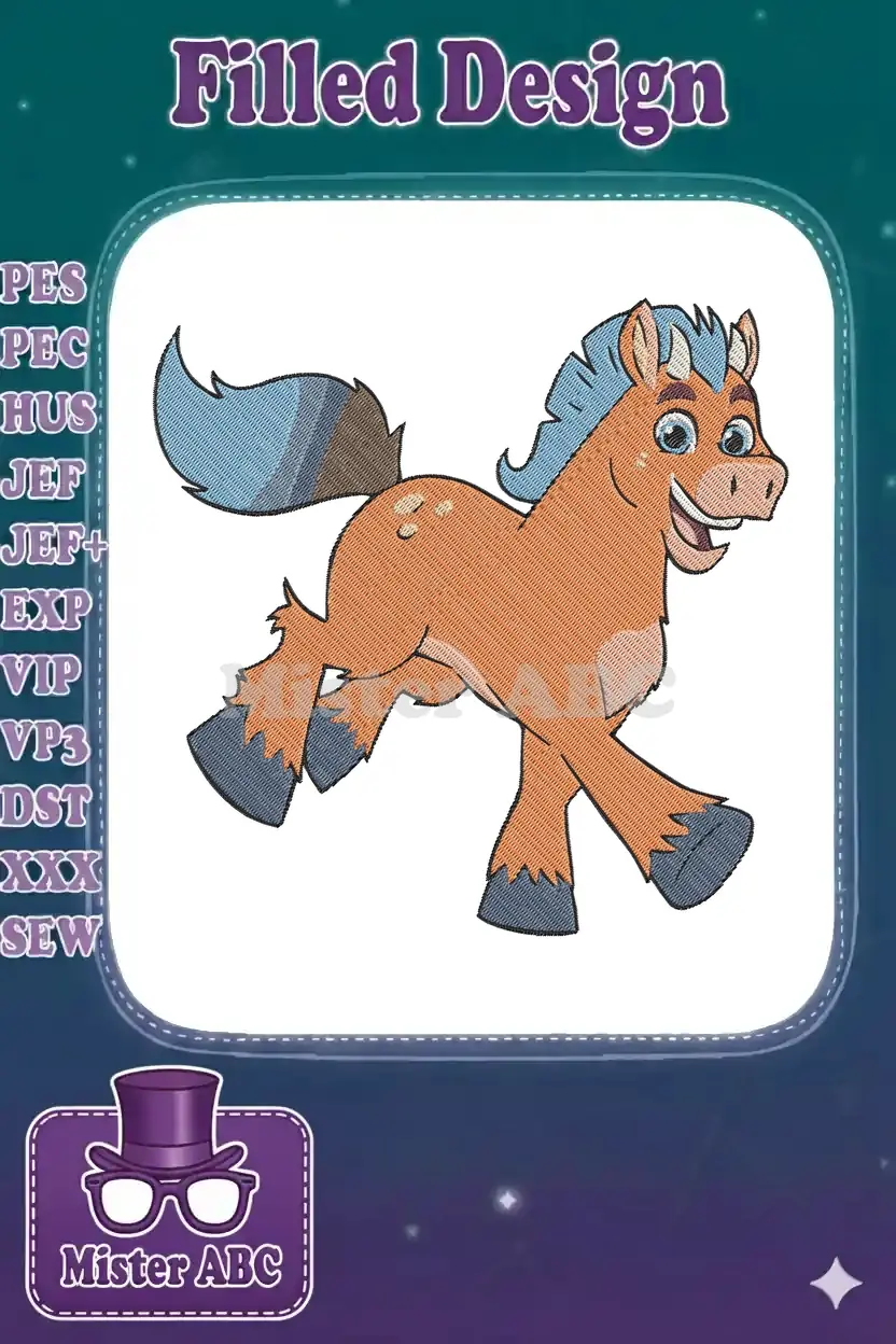 Cute Happy Cartoon Horse Blue Mane Tail Running Embroidery Designs