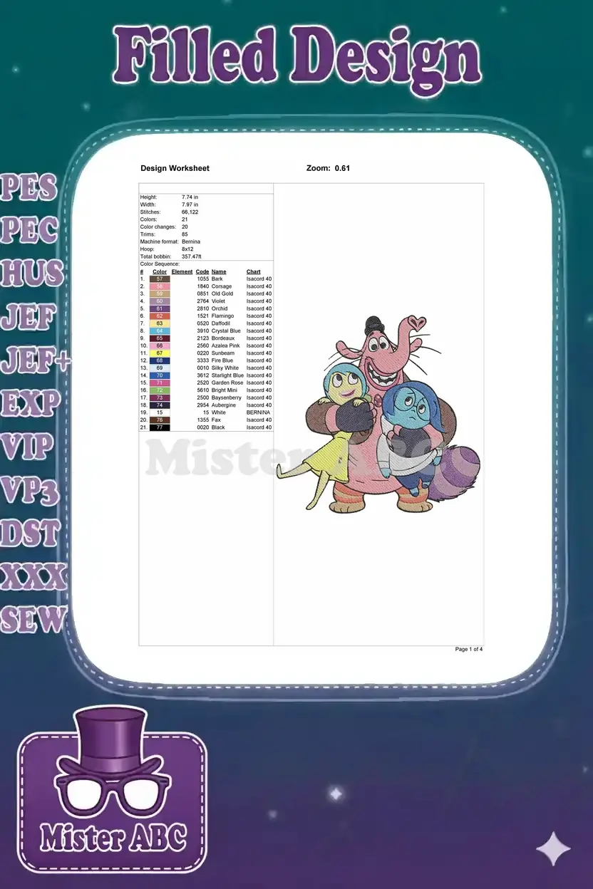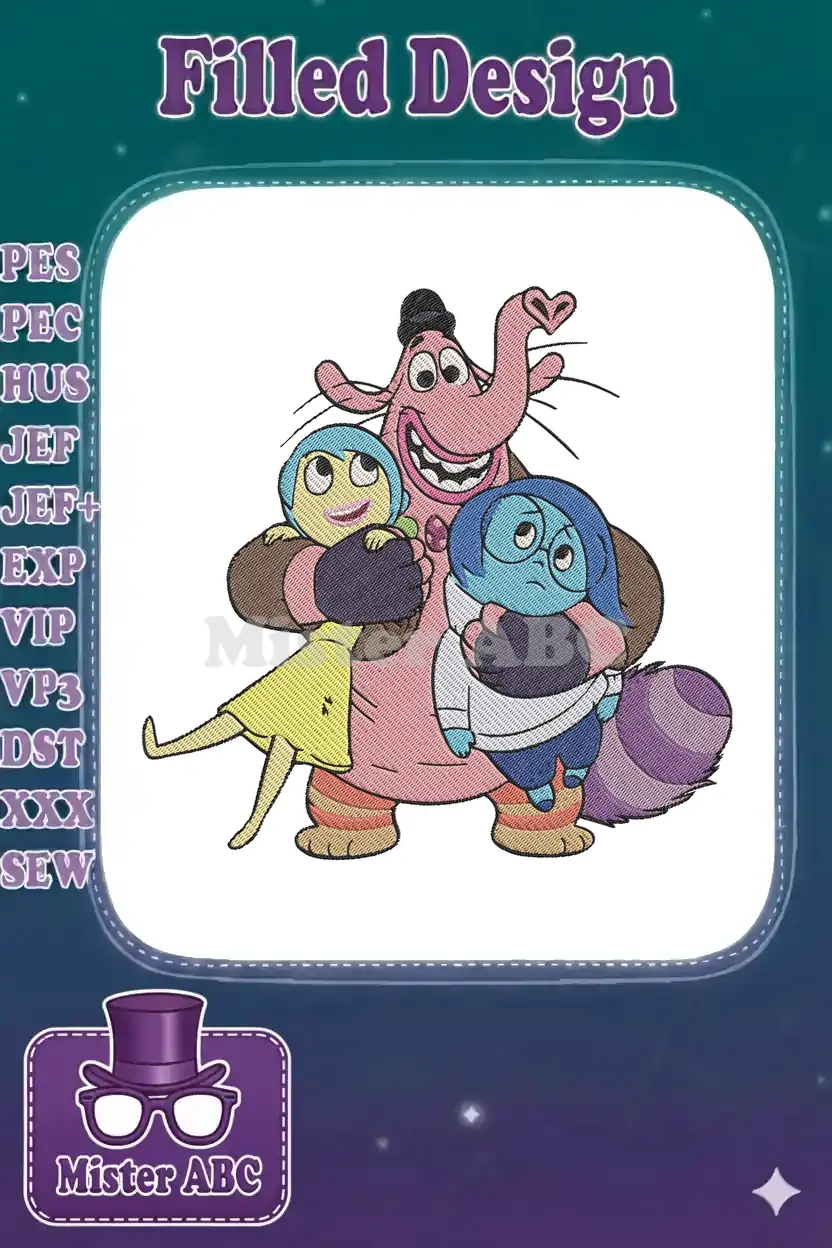 Cute Inside Out Bing Bong Joy Sadness hugging friends embroidery designs