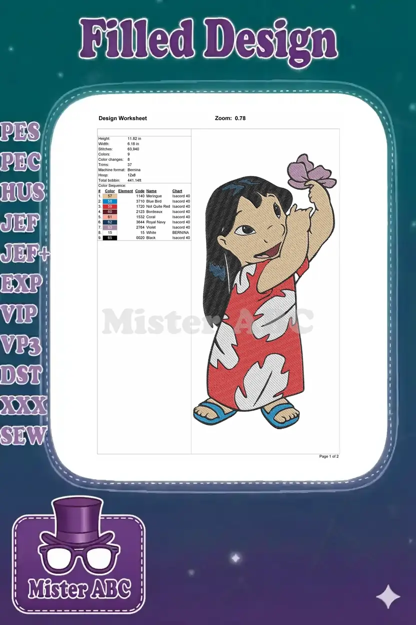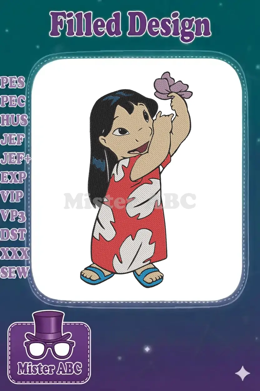 Cute Lilo Disney Character with Flower Red Dress Embroidery Designs