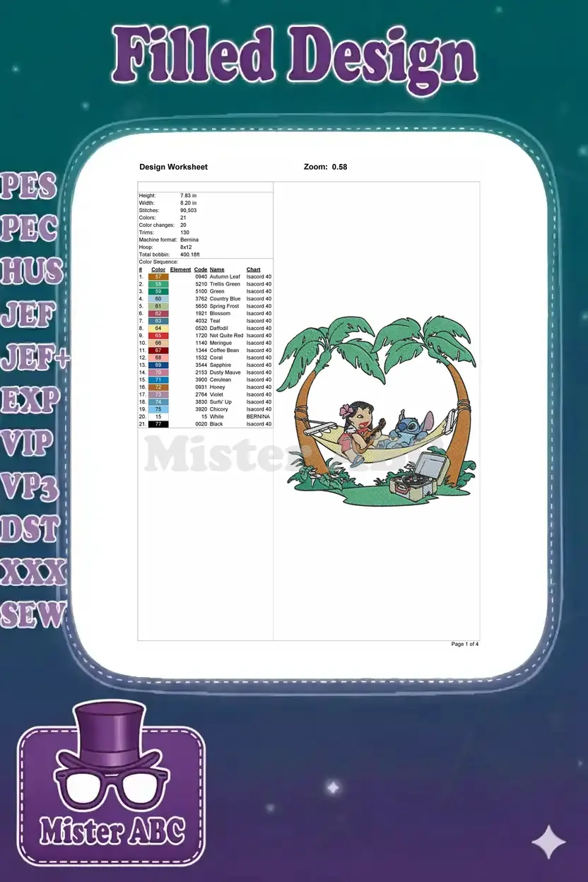 Capture the aloha spirit with this delightful Lilo & Stitch embroidery, featuring them relaxing in a heart-shaped palm tree hammock. Perfect for a touch of tropical charm!