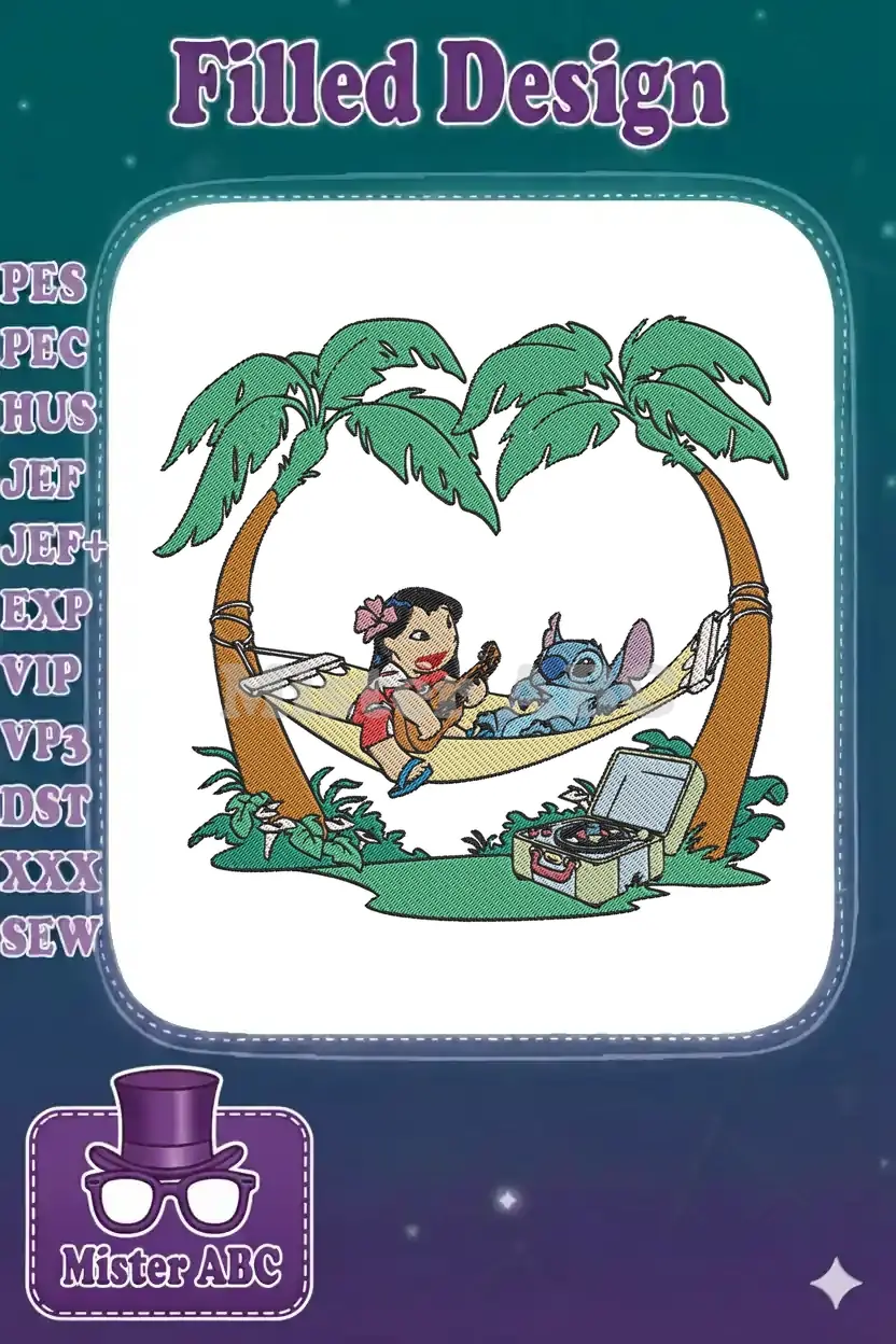 Cute Lilo and Stitch playing ukulele tropical hammock embroidery designs – Instant Download