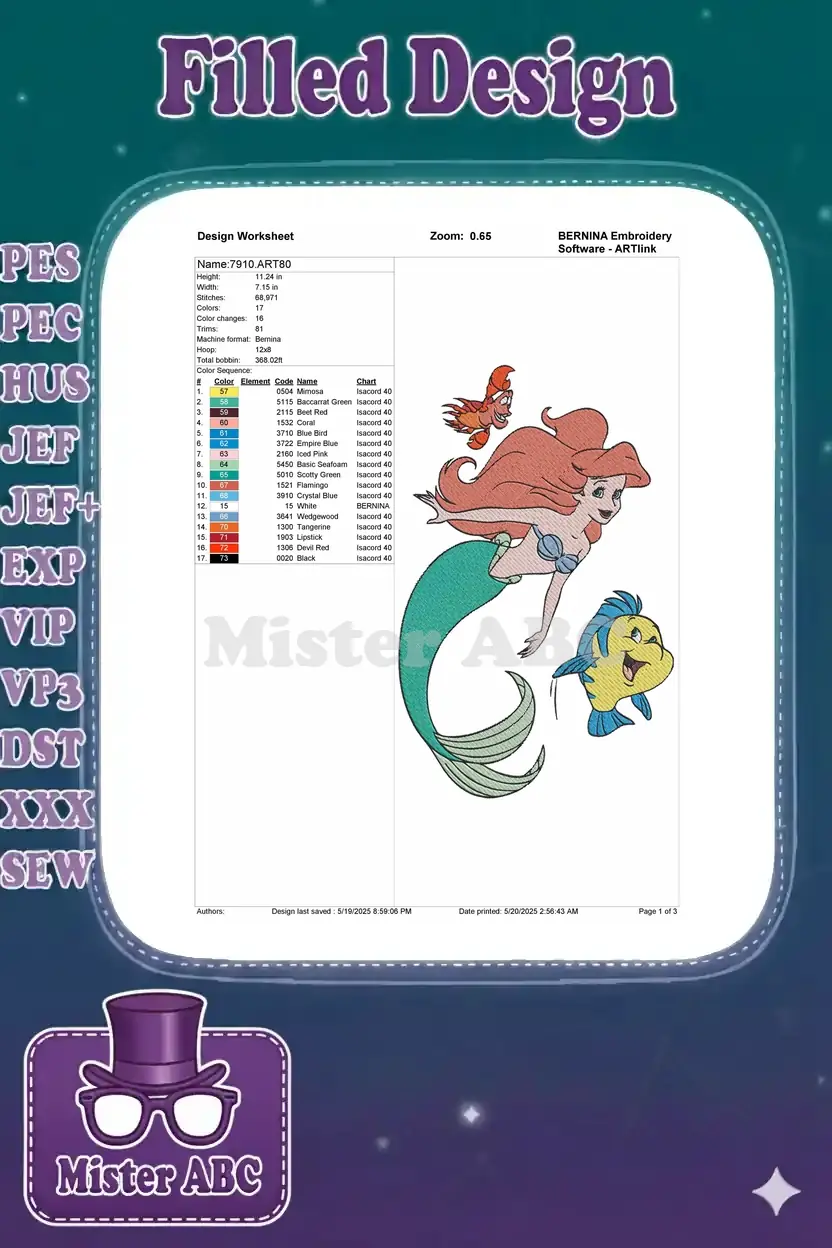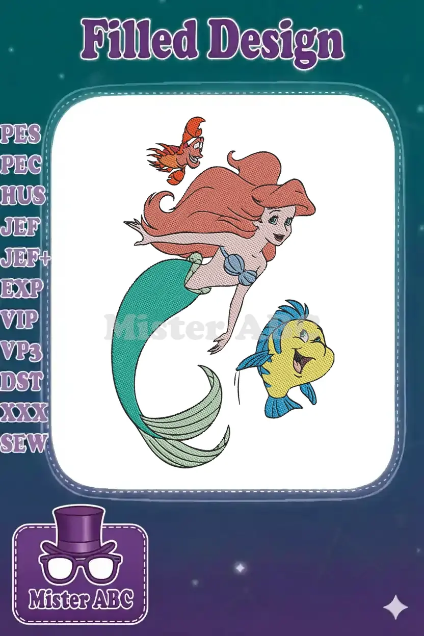 Cute Little Mermaid Ariel Sebastian Flounder cartoon embroidery designs