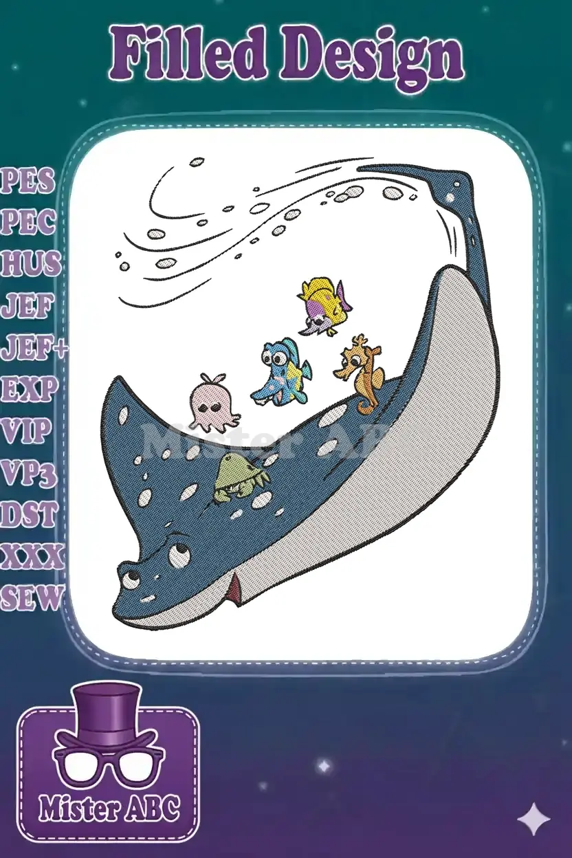 Dive into an ocean adventure with this vibrant embroidery design featuring Mr. Ray and his cheerful students. Perfect for fans!