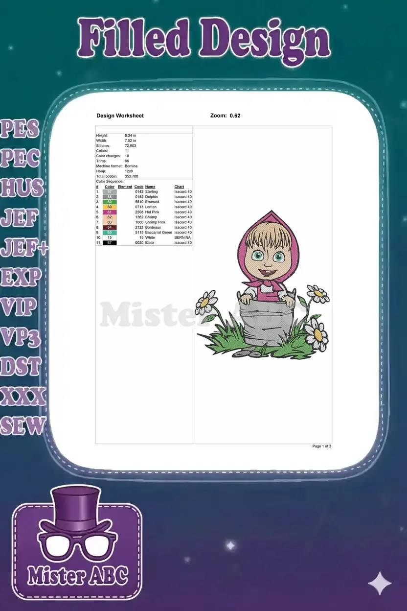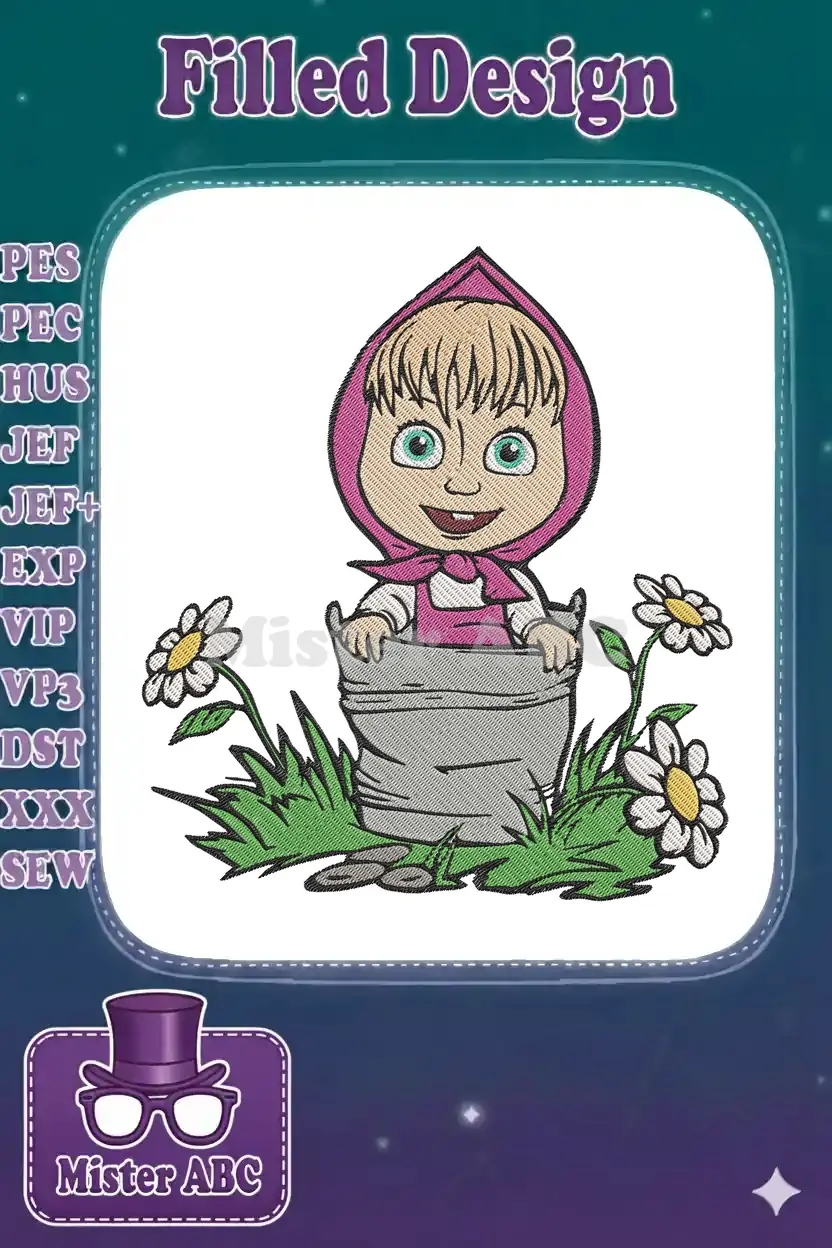 Adorable Masha embroidery design featuring the beloved character in a charming bucket, surrounded by cheerful daisies.
