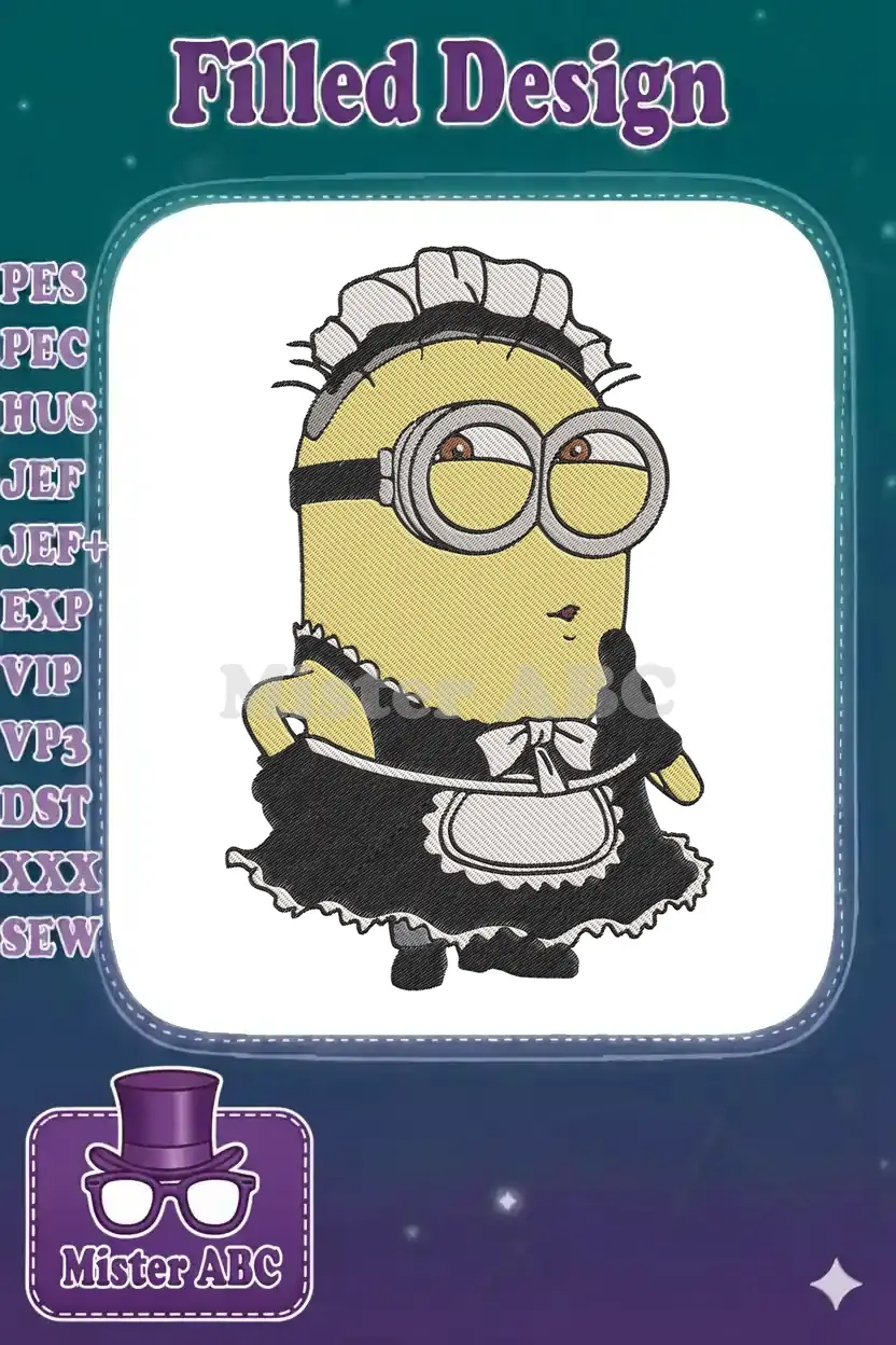 Delightful Minion maid embroidery design, perfect for adding a touch of playful charm to any project. A unique and fun character piece.
