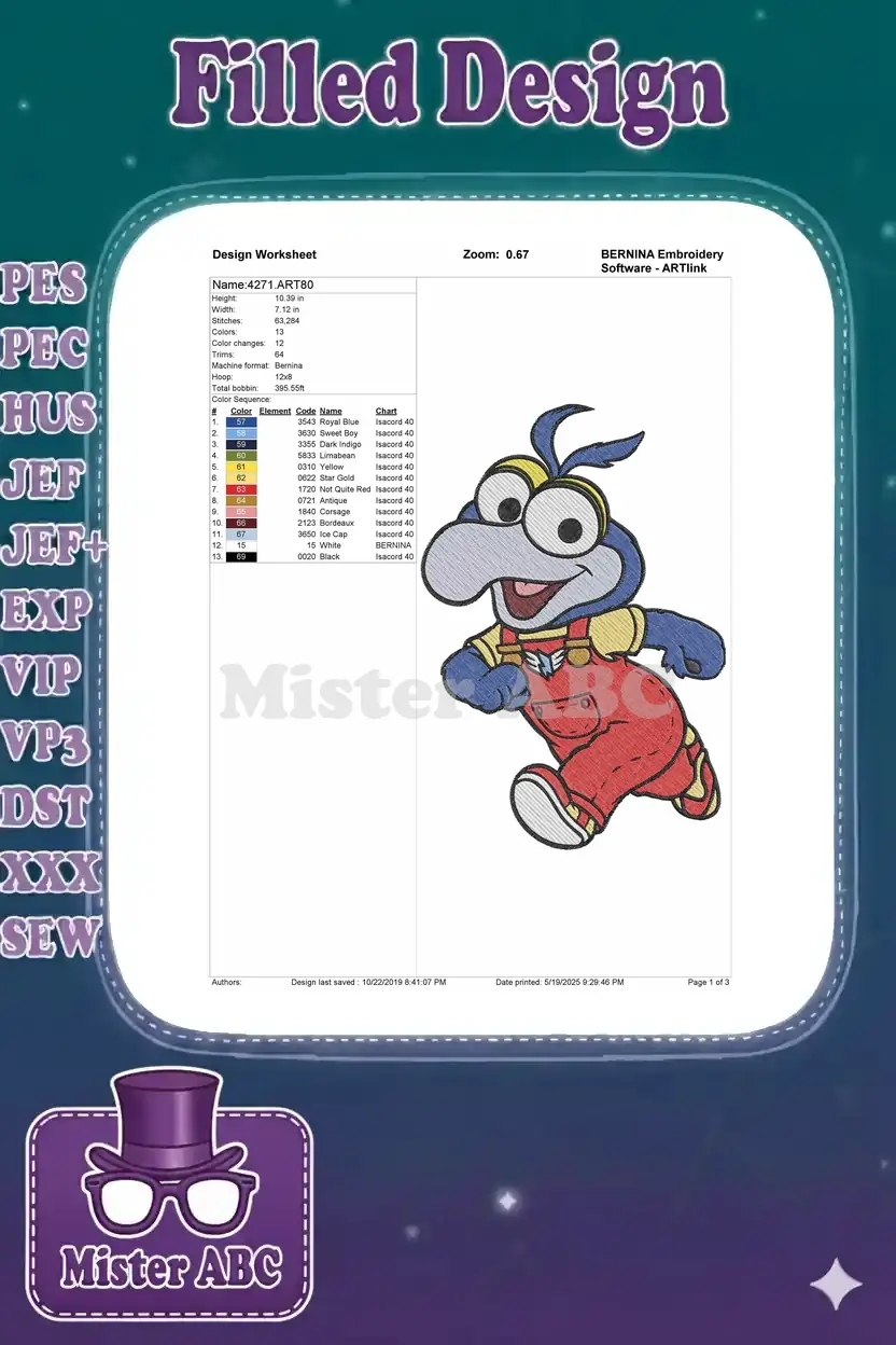 Cute Muppet Babies Gonzo Running Cartoon Character Embroidery Designs