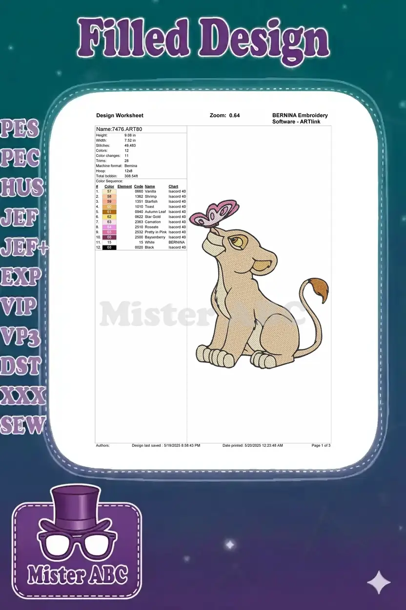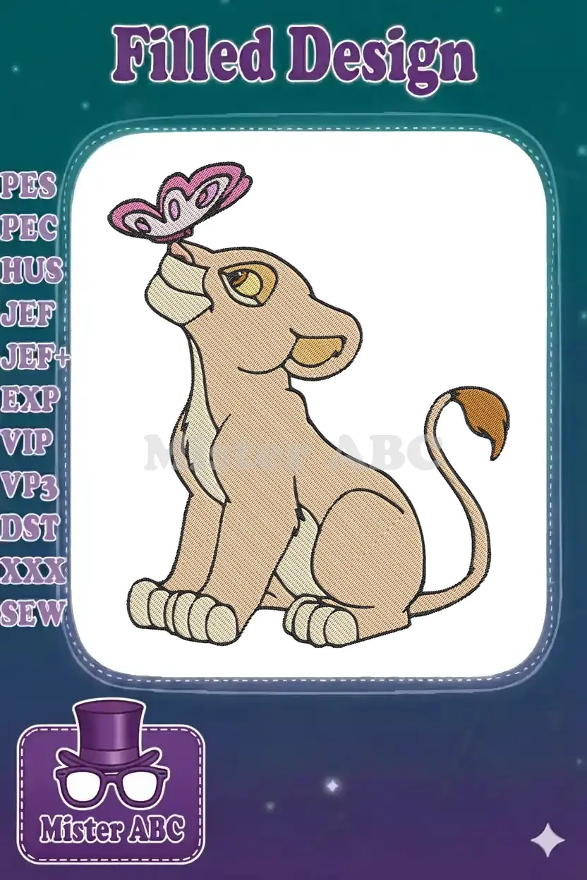 Cute Nala Lion Cub with Pink Butterfly Embroidery Designs