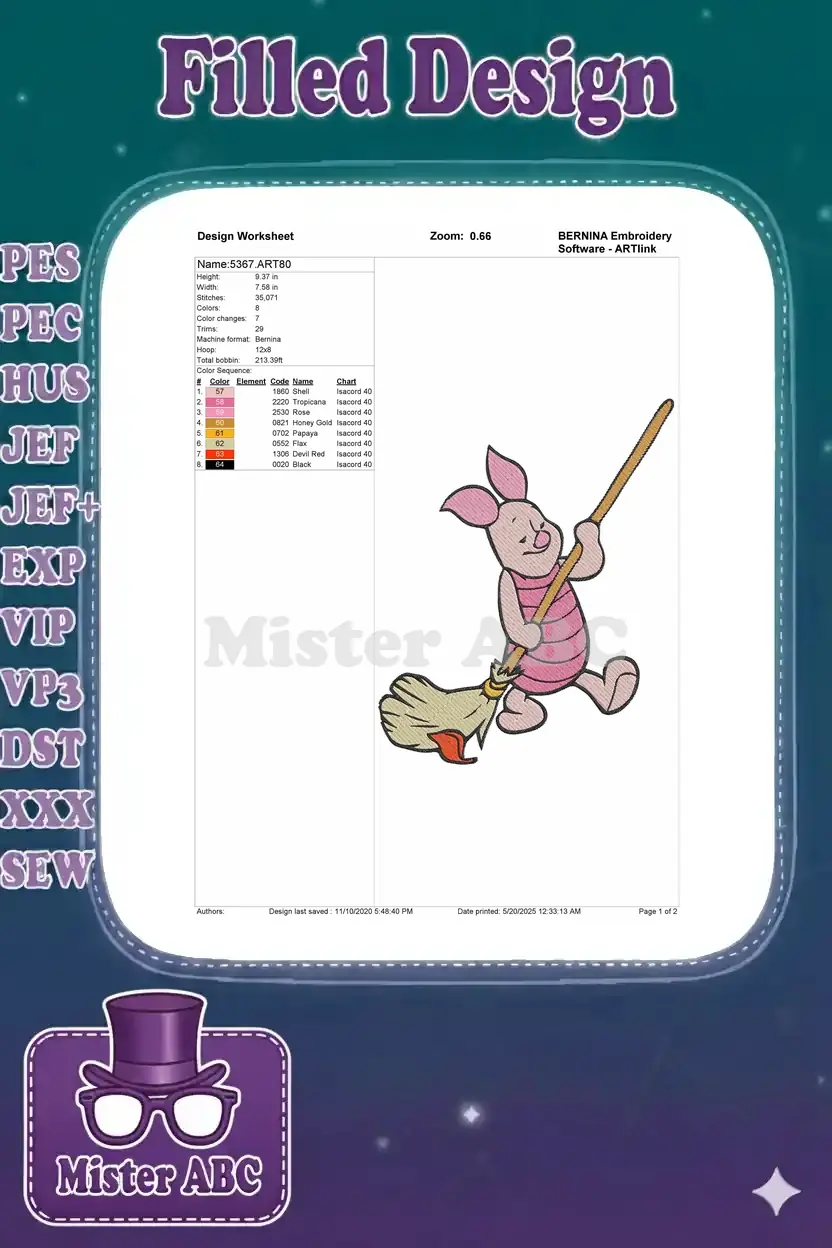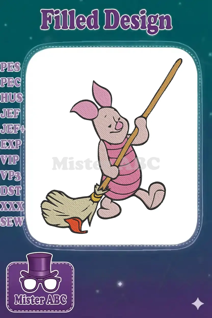 Cute Piglet Winnie Pooh character holding broom embroidery designs
