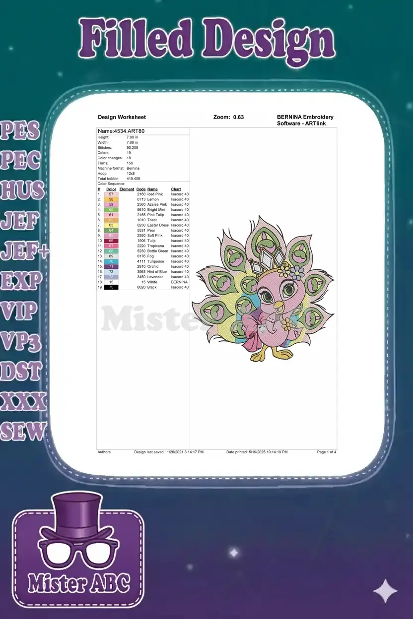 Cute Pink Peacock Chick Princess Crown Embroidery Designs