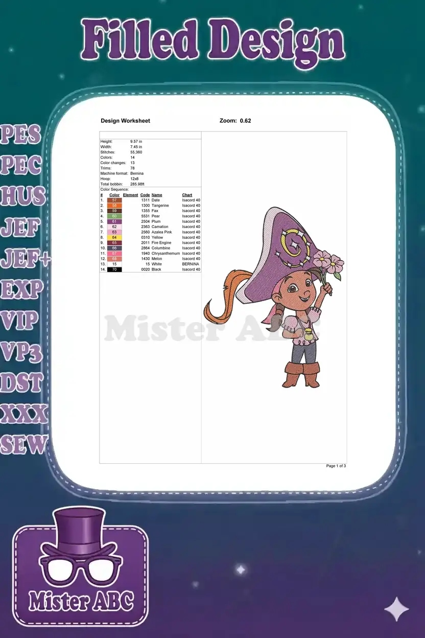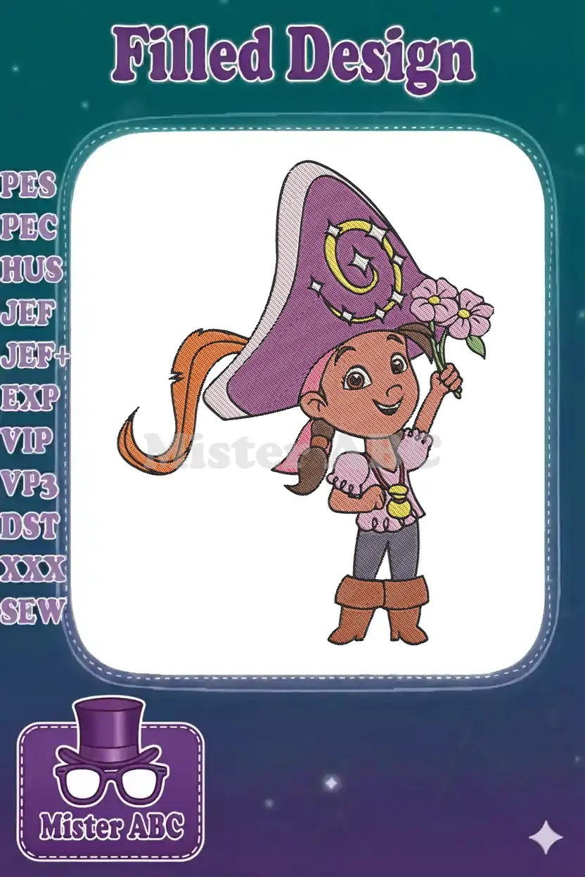 Cute pirate girl holding flowers cartoon embroidery designs for kids