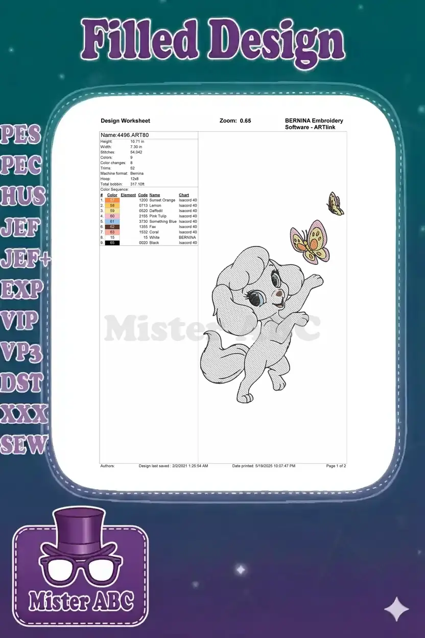 Cute playful puppy chasing butterflies cartoon embroidery designs for kids