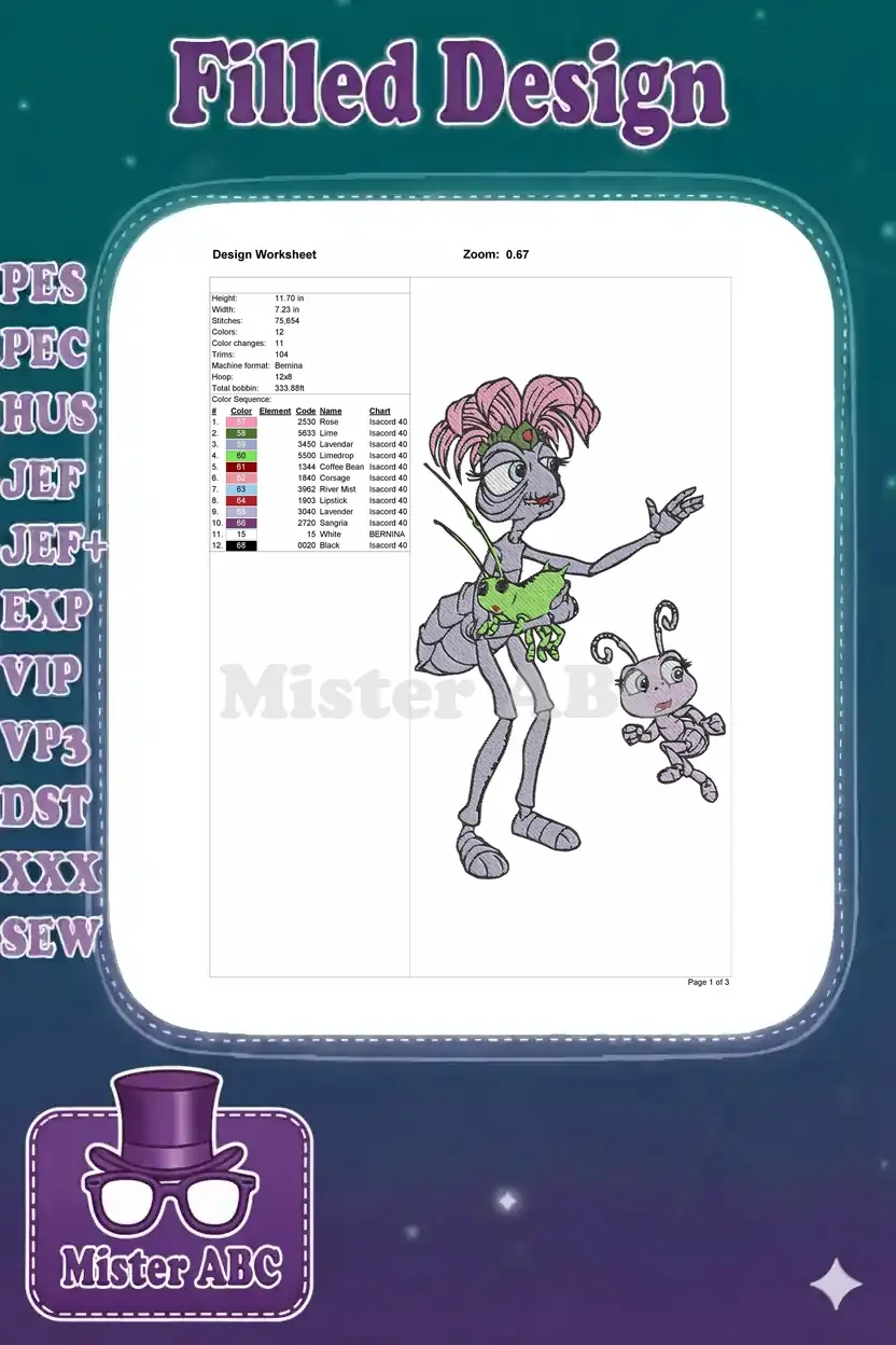 Embrace the charming world of A Bug’s Life with this delightful embroidery design featuring Gypsy and Dot. Perfect for any fan!