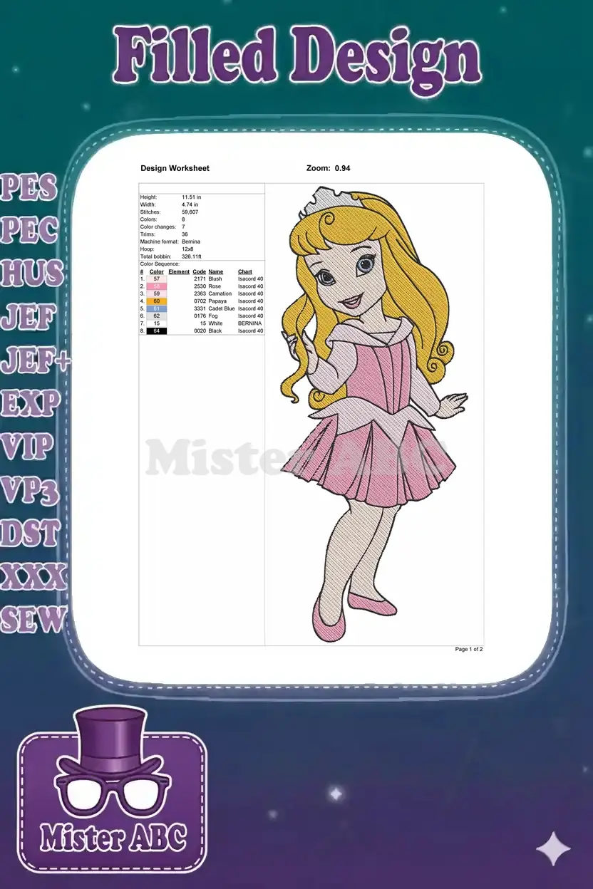 Cute Princess Aurora Blonde Hair Pink Dress embroidery designs