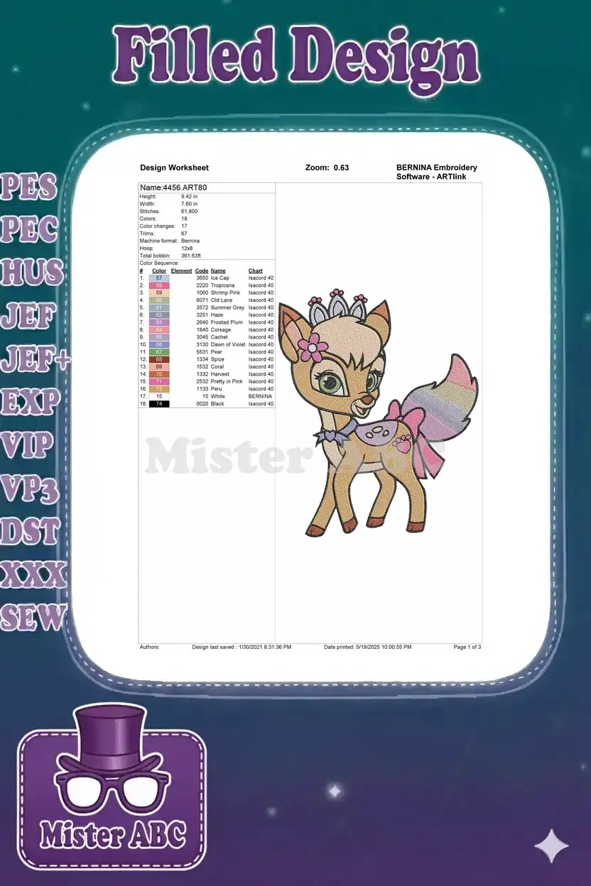 Enchanting fawn princess embroidery design, perfect for adding a touch of royal charm to any project. Adorable and detailed!