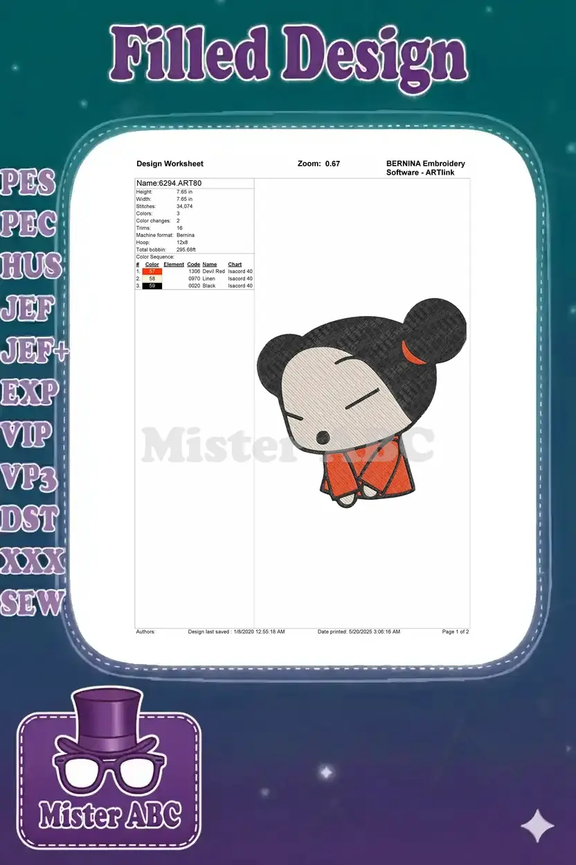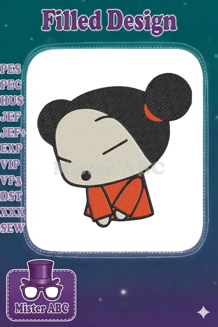 Cute Pucca character embroidery designs with closed eyes and orange outfit