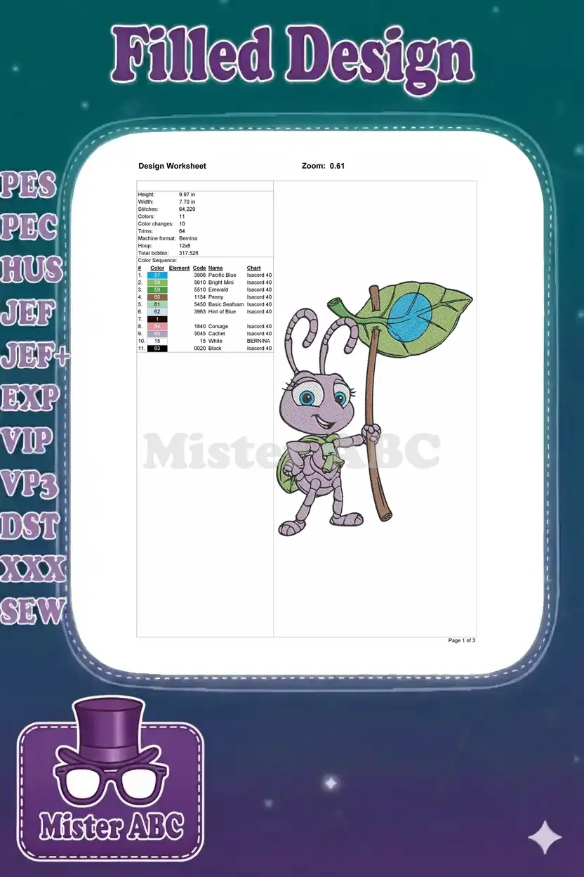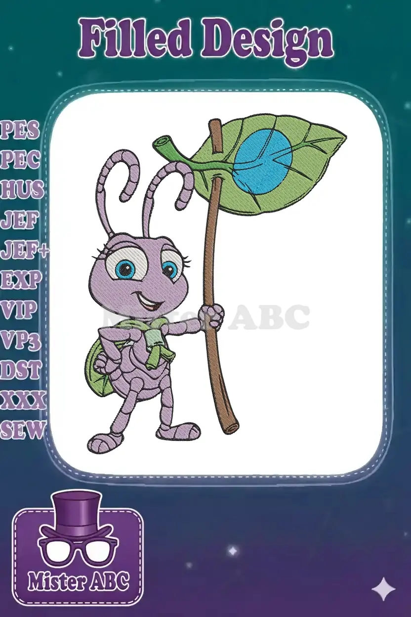 Adorable embroidery design featuring a cheerful purple ant character holding a vibrant green leaf banner, perfect for kids’ apparel.