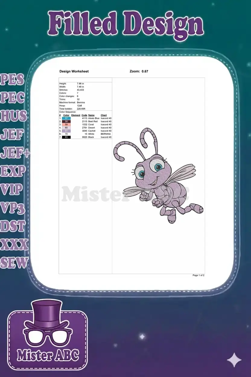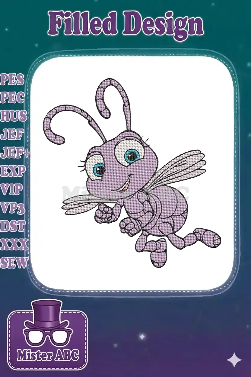 Cute Purple Bug Flying Cartoon Character Embroidery Designs