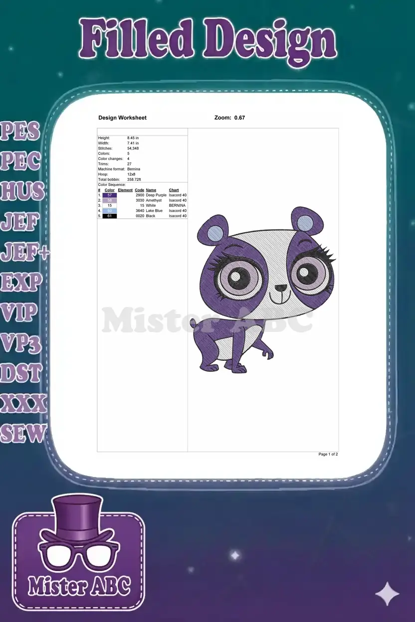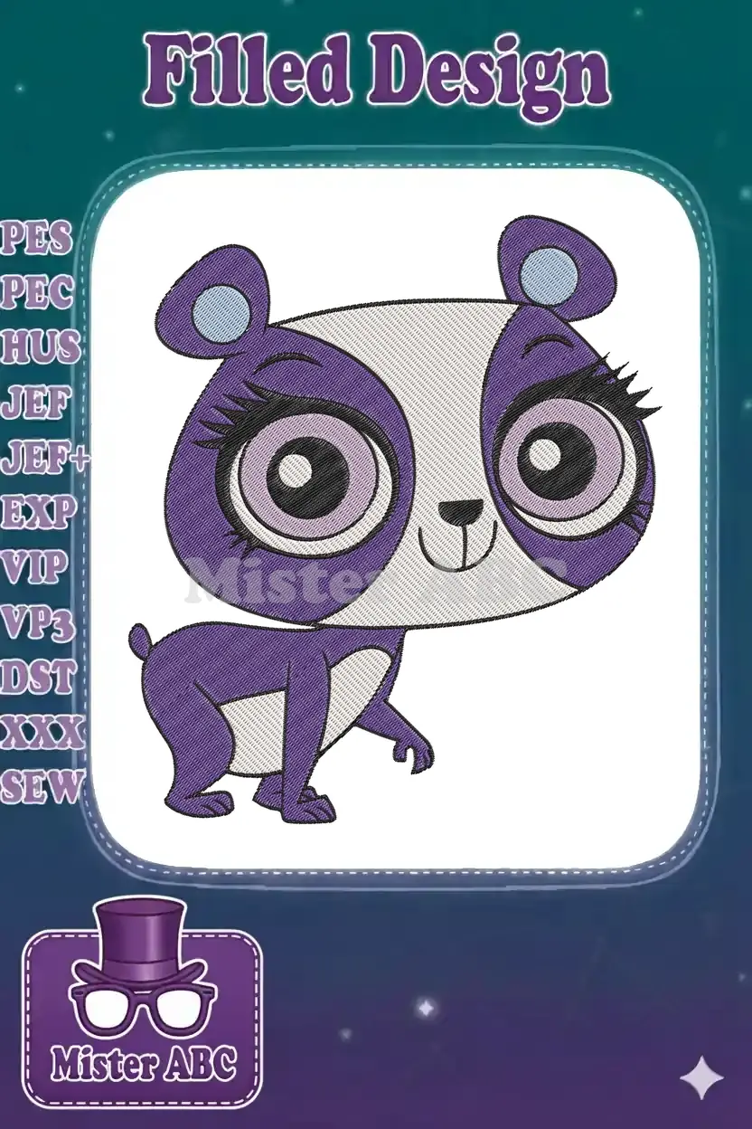 Cute purple cartoon panda embroidery designs for children