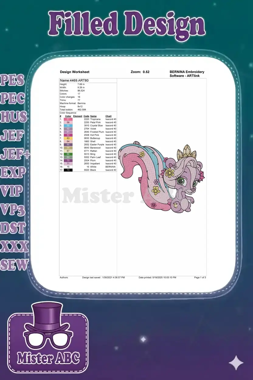 A whimsical princess pet embroidery design, featuring a charming purple skunk with a glittering crown and floral accents. Perfect for adding a touch of enchantment to any project.