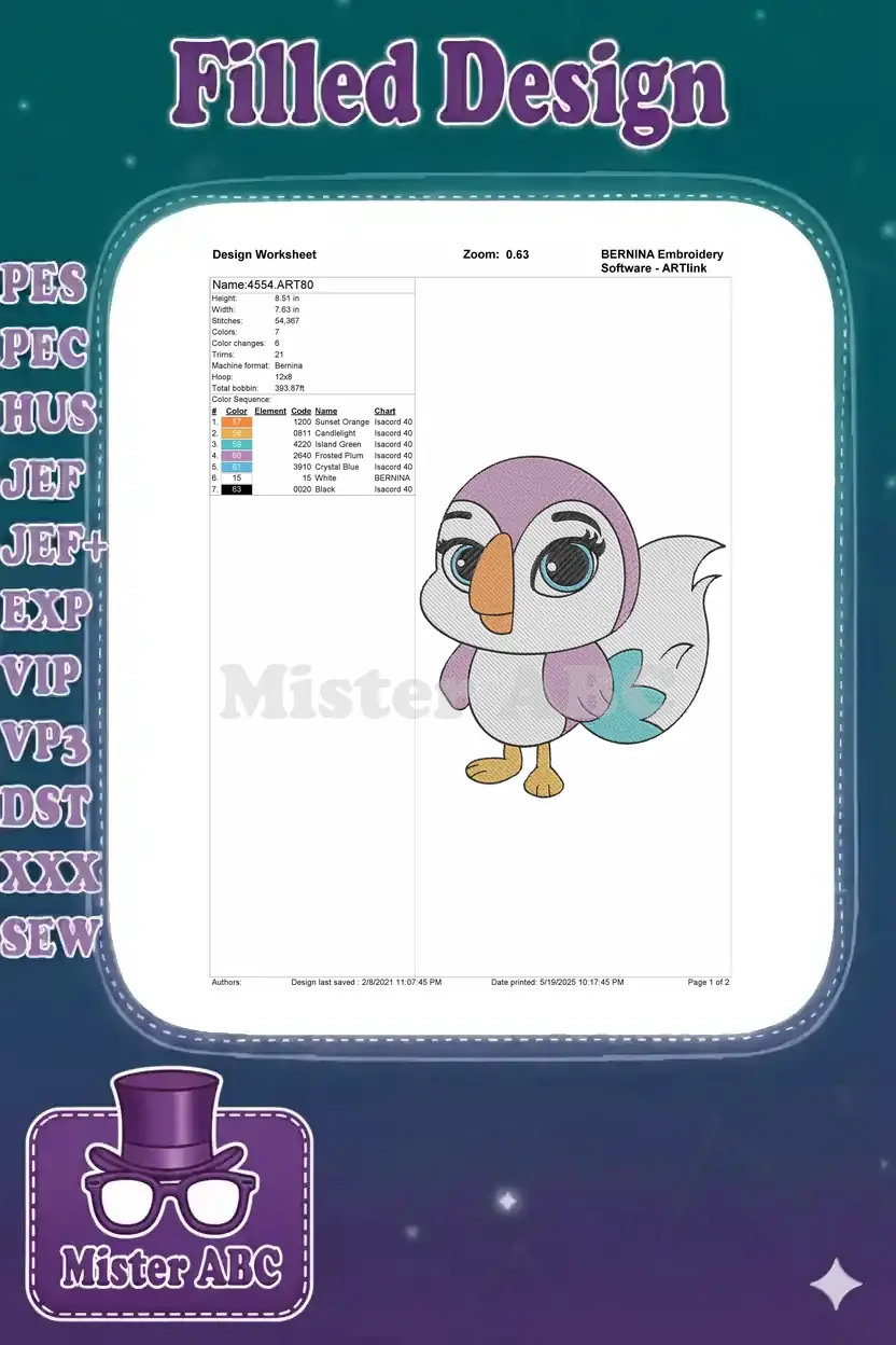 Cute Purple and White Cartoon Bird Embroidery Designs for Children