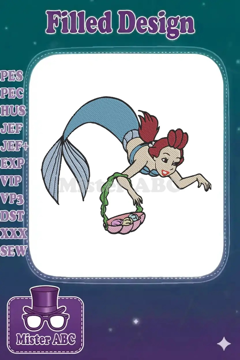 Cute red-haired mermaid holding Easter basket embroidery designs