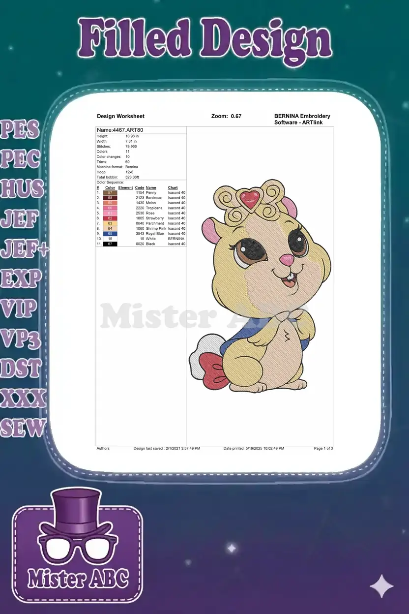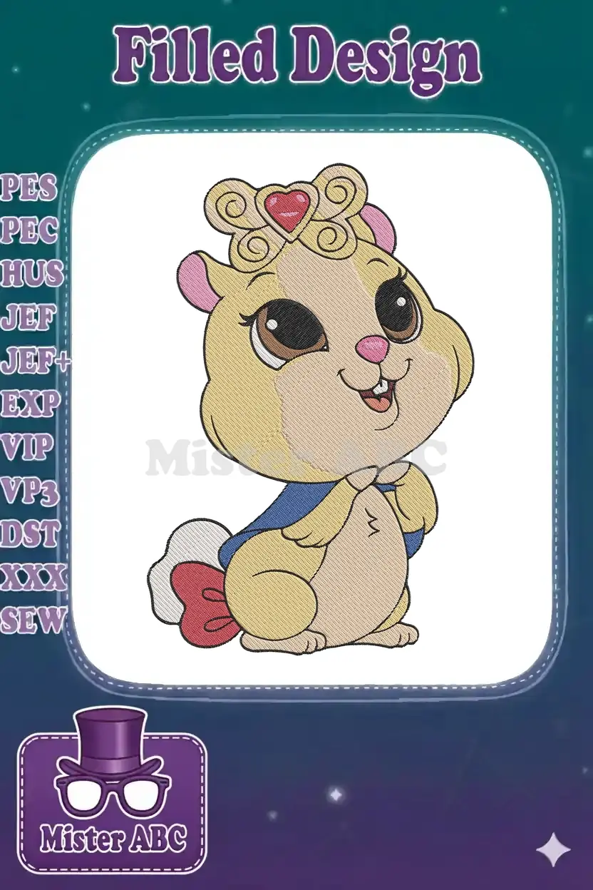 An enchanting embroidery design featuring a charming princess hamster with a heart crown and royal cape, perfect for adding a touch of fairytale magic to any project.