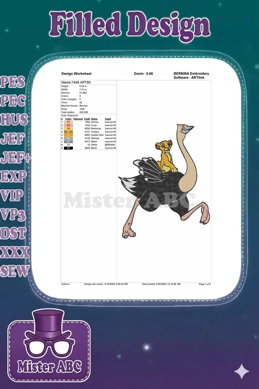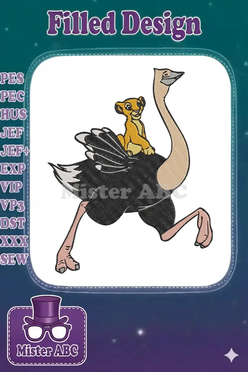 Cute Simba lion cub riding large ostrich embroidery designs