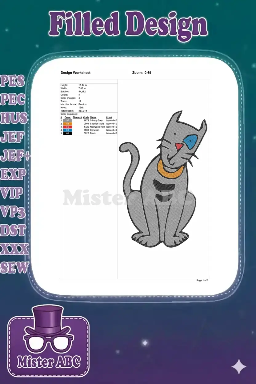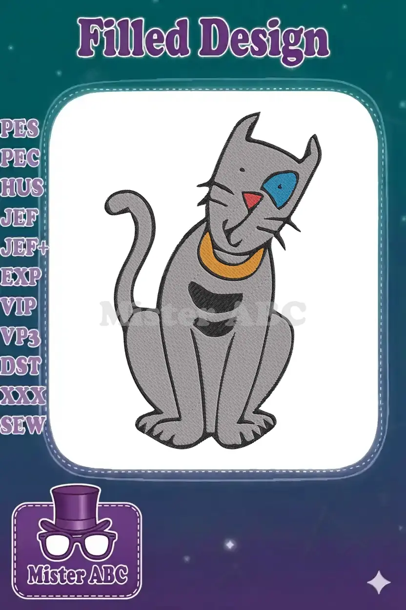 Cute Sitting Grey Cat with Blue Eye Embroidery Designs