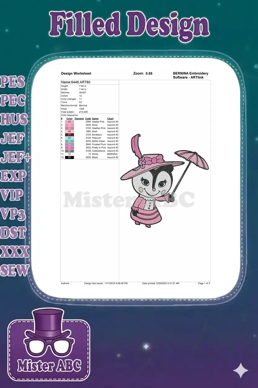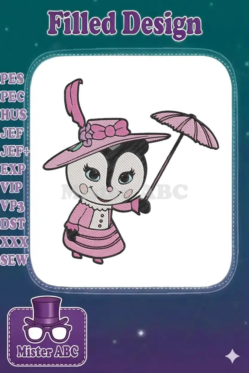 Cute Skunk Lady Pink Victorian Outfit Umbrella Embroidery Designs