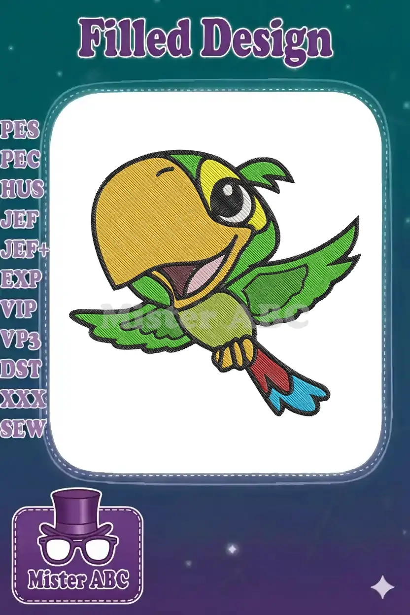 Cute smiling cartoon parrot flying colorful embroidery designs
